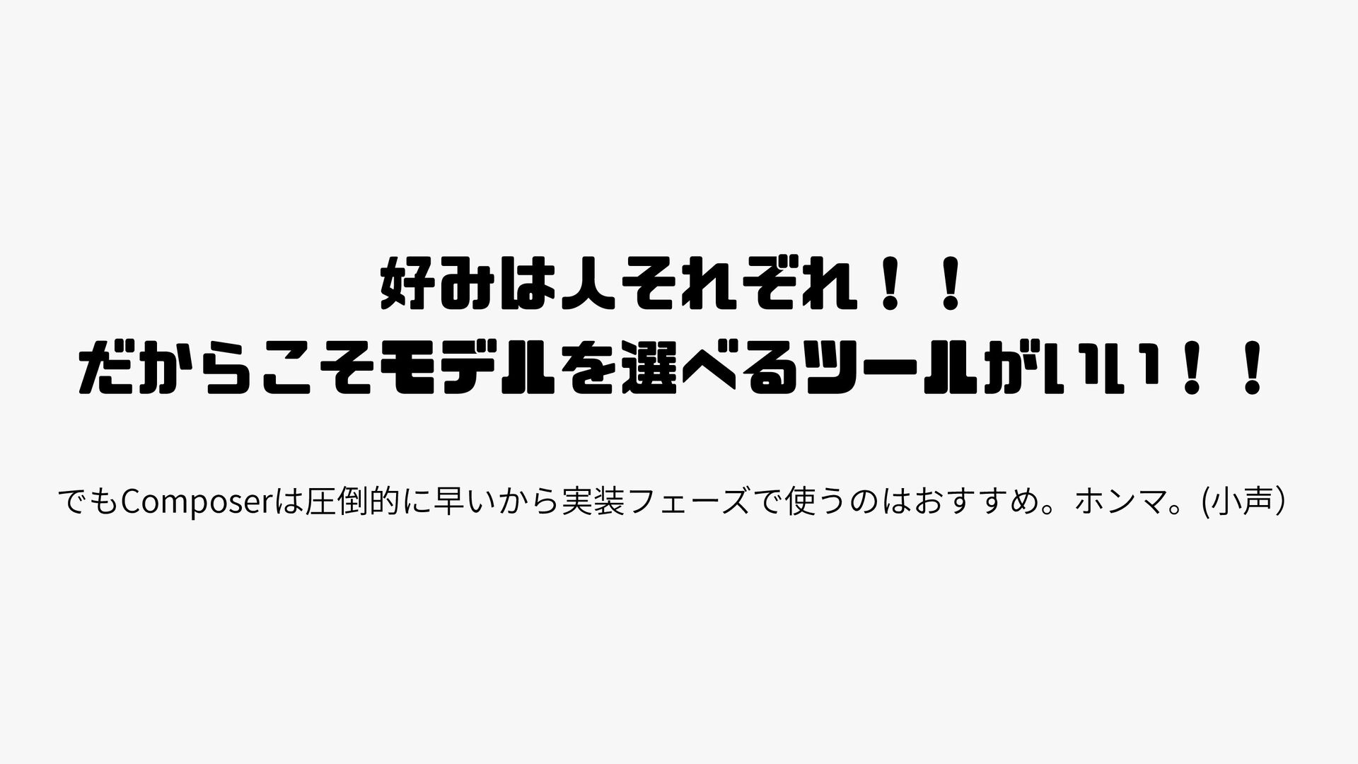 好みは人それぞれ!! だからこそモデルを選べるツールがいい!! でもComposerは圧倒的に早いから実装フェーズで使うのはおすすめ。ホンマ。(小声)