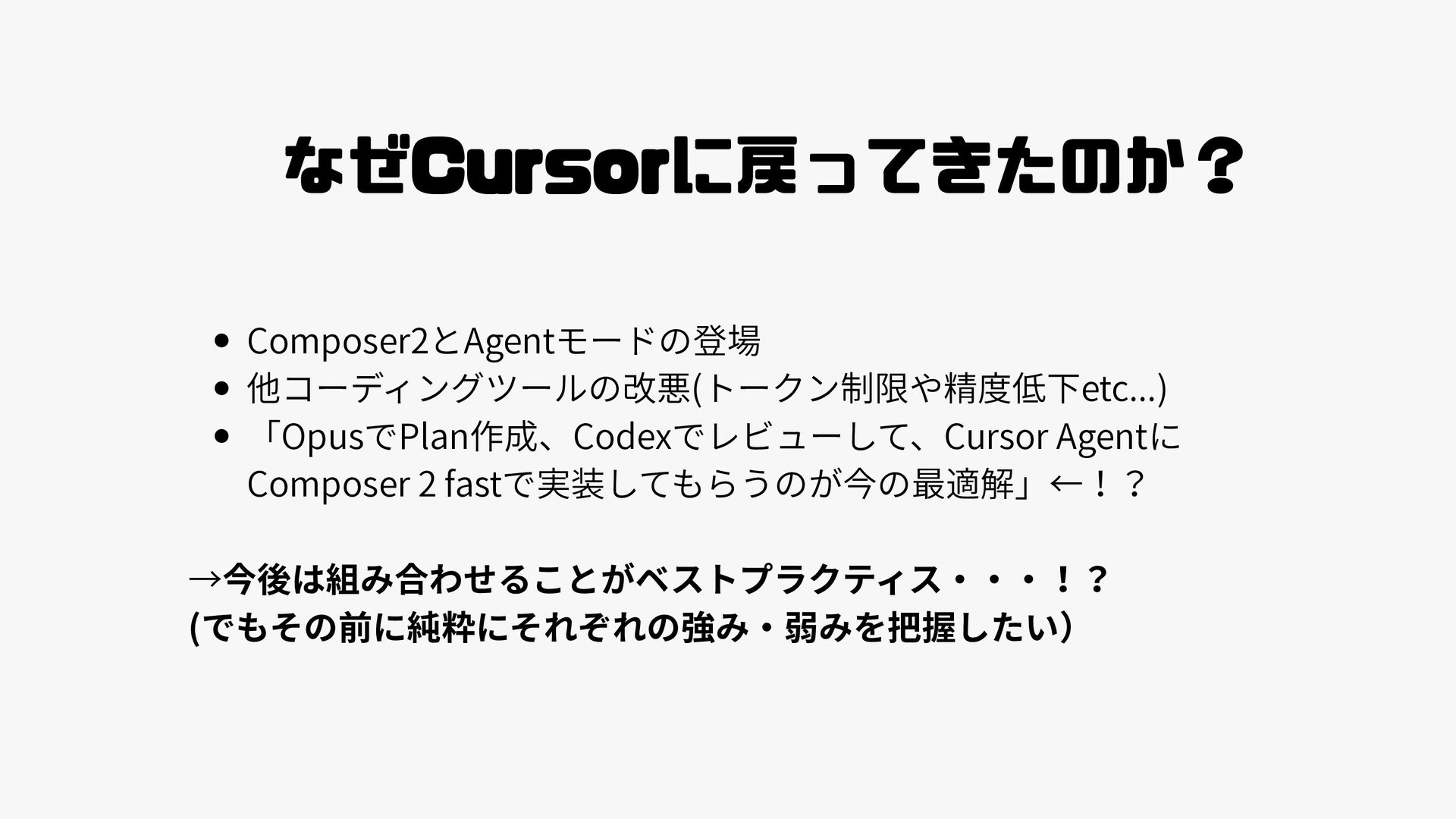 なぜCursorに戻ってきたのか? Composer2とAgentモードの登場 他コーディングツールの改悪(トークン制限や精度低下etc...) 「OpusでPlan作成、Codexでレビューして、Cursor Agentに Composer 2 fastで実装してもらうのが今の最適解」←!? →今後は組み合わせることがベストプラクティス・・・!? (でもその前に純粋にそれぞれの強み・弱みを把握したい)