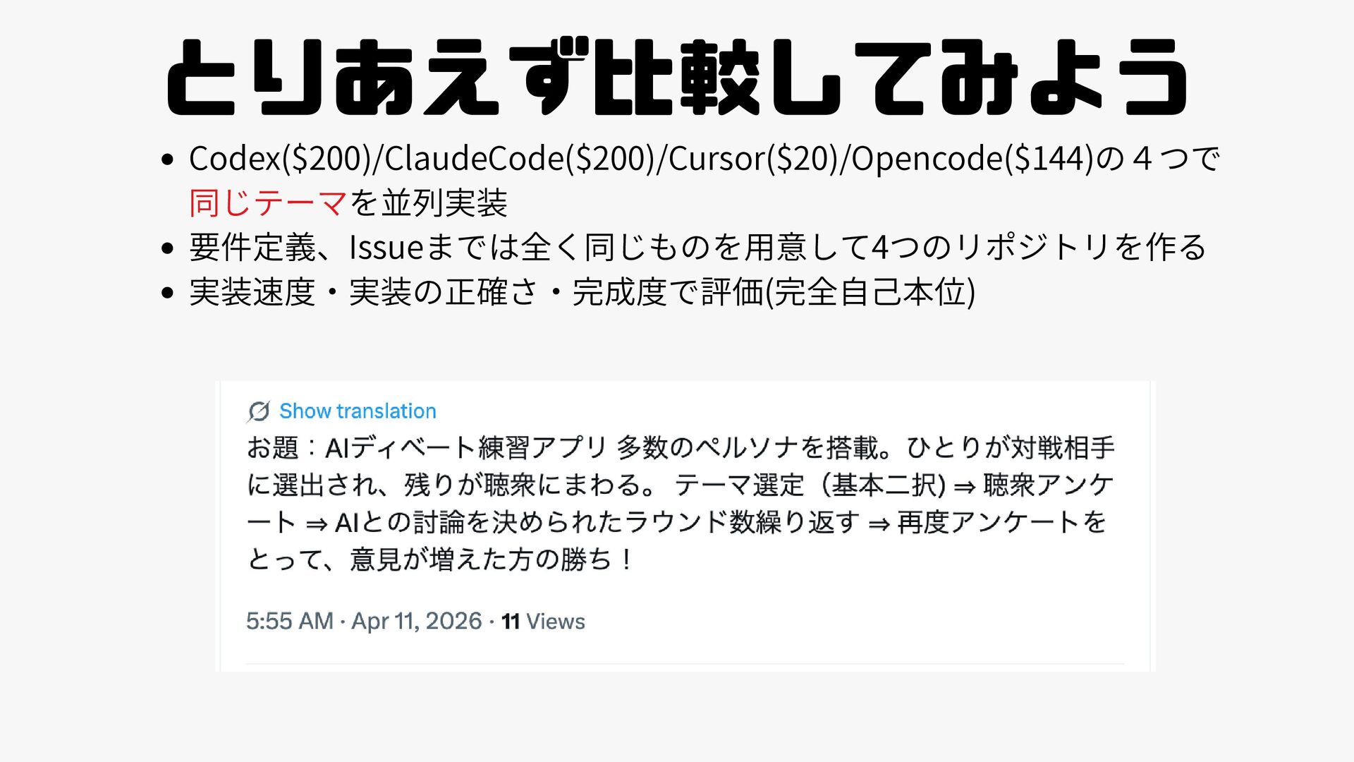 とりあえず比較してみよう Codex($200)/ClaudeCode($200)/Cursor($20)/Opencode($144)の4つで 同じテーマを並列実装 要件定義、Issueまでは全く同じものを用意して4つのリポジトリを作る 実装速度・実装の正確さ・完成度で評価(完全自己本位)