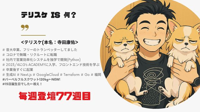 # 社内で営業効率化システムを独学で開発(Python) # 2023/4 にG’s ACADEMY に入学、フロントエンド技術を学ぶ # 卒業後すぐに起業 # 生成AI # Next.js # GoogleCloud # Terraform # Go # 福岡 # バーベルフルスクワット120kg ←NEW! #15 日誕生日でした←祝え! 毎週登壇77週目