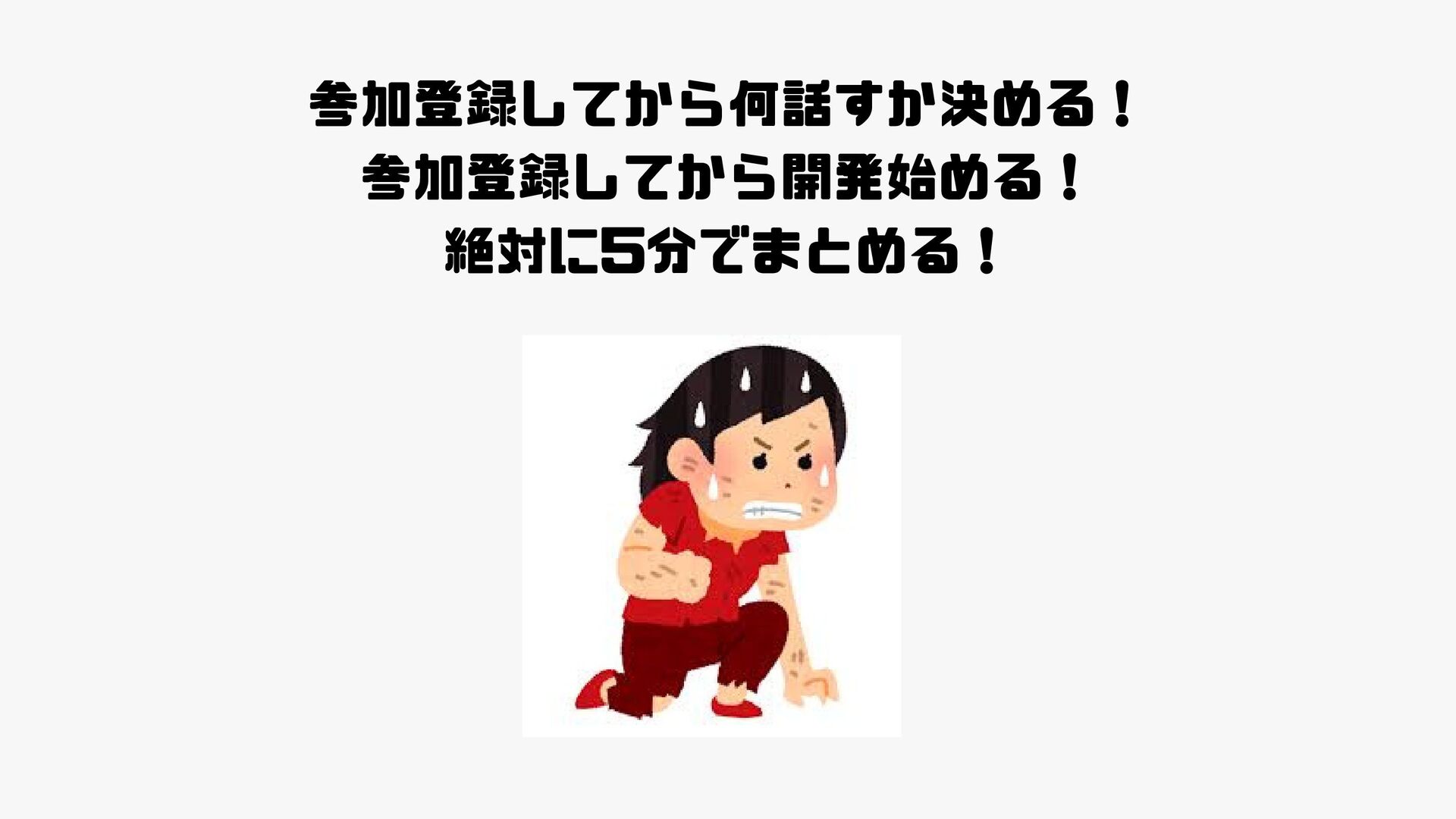 参加登録してから何話すか決める! 参加登録してから開発始める! 絶対に5分でまとめる!