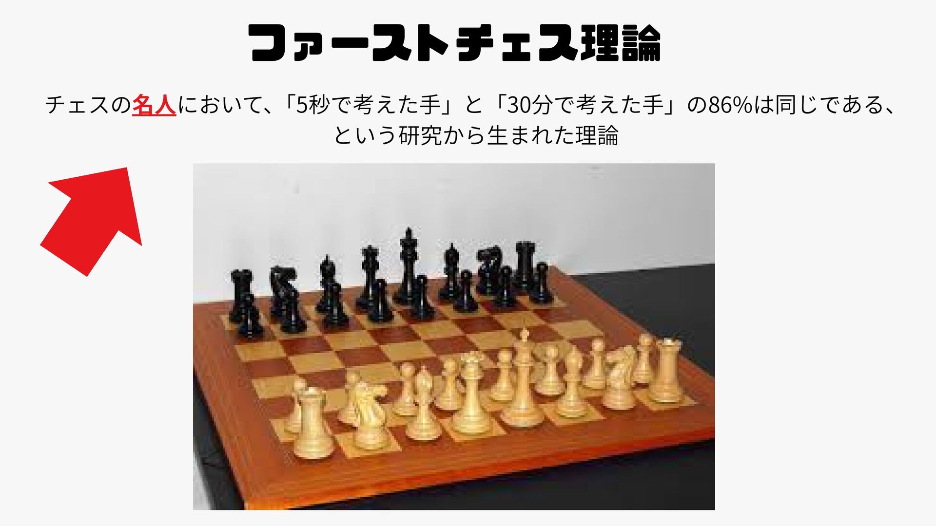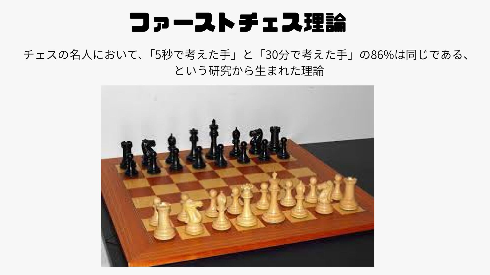 ファーストチェス理論 チェスの名人において、 「5秒で考えた手」と「30分で考えた手」の86%は同じである、 という研究から生まれた理論