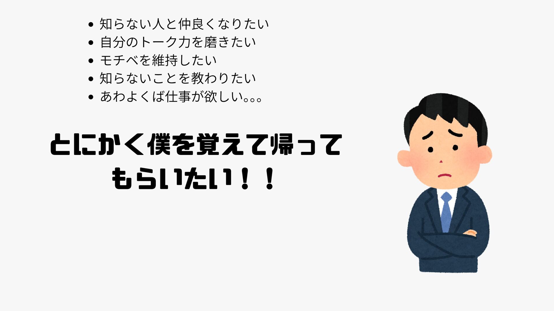 知らない人と仲良くなりたい 自分のトーク力を磨きたい モチベを維持したい 知らないことを教わりたい あわよくば仕事が欲しい。 。 。 とにかく僕を覚えて帰って もらいたい!!