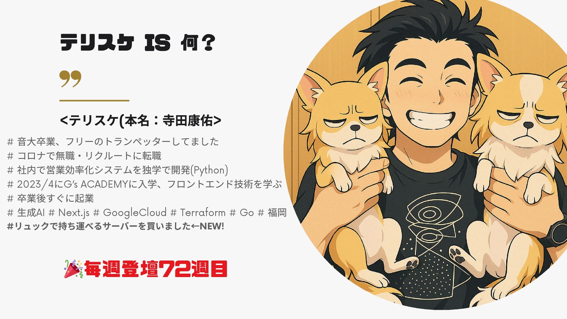 # 社内で営業効率化システムを独学で開発(Python) # 2023/4 にG’s ACADEMY に入学、フロントエンド技術を学ぶ # 卒業後すぐに起業 # 生成AI # Next.js # GoogleCloud # Terraform # Go # 福岡 # リュックで持ち運べるサーバーを買いました←NEW! 🎉毎週登壇72週目