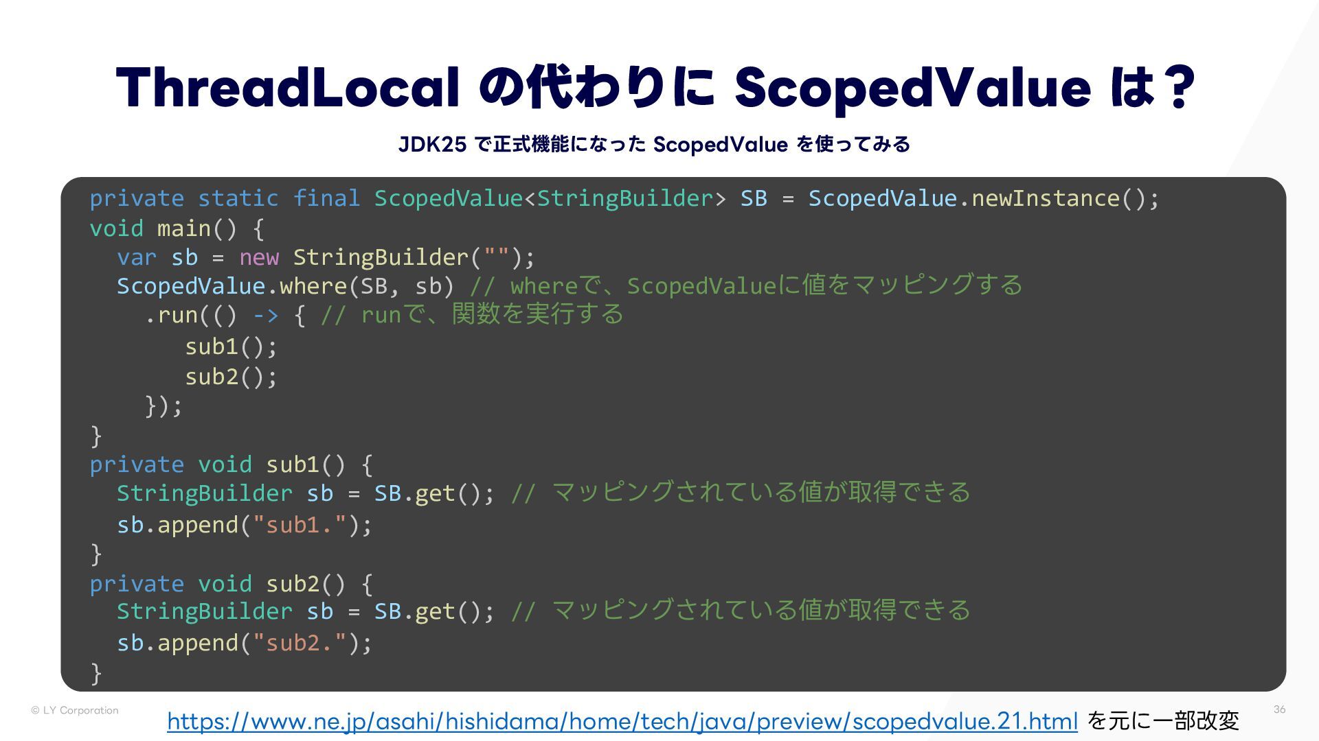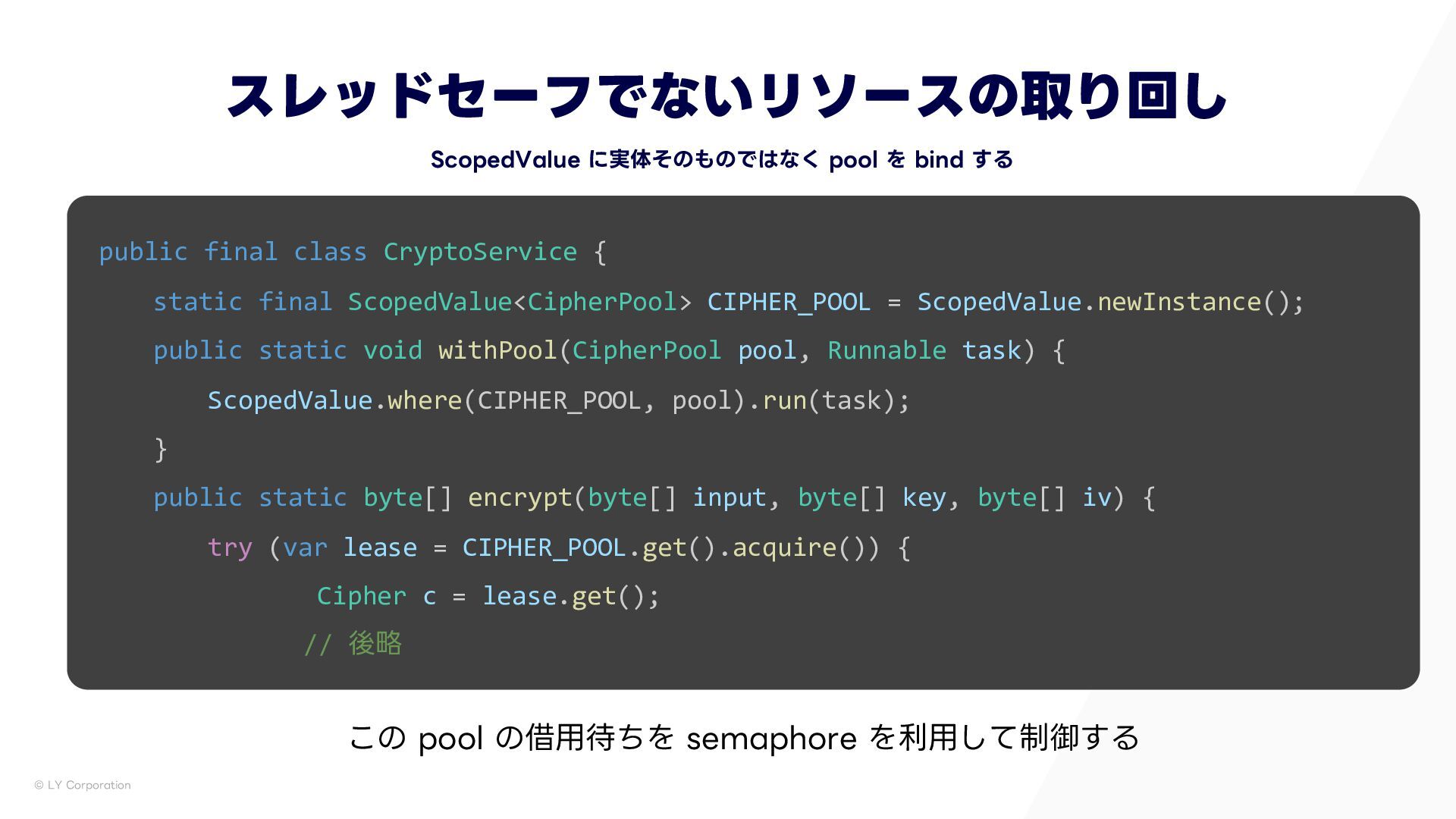 final class CryptoService { static final ScopedValue<CipherPool> CIPHER_POOL = ScopedValue.newInstance(); public static void withPool(CipherPool pool, Runnable task) { ScopedValue.where(CIPHER_POOL, pool).run(task); } public static byte[] encrypt(byte[] input, byte[] key, byte[] iv) { try (var lease = CIPHER_POOL.get().acquire()) { Cipher c = lease.get(); // ޙུ ͜ͷ QPPMͷआ༻ͪΛ TFNBQIPSFΛར༻੍ͯ͠ޚ͢Δ