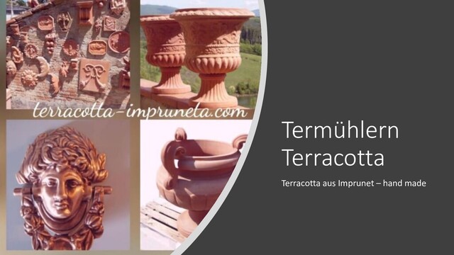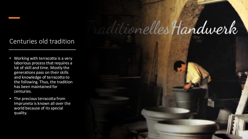 laborious process that requires a lot of skill and time. Mostly the generations pass on their skills and knowledge of terracotta to the following. Thus, the tradition has been maintained for centuries. • The precious terracotta from Impruneta is known all over the world because of its special quality.