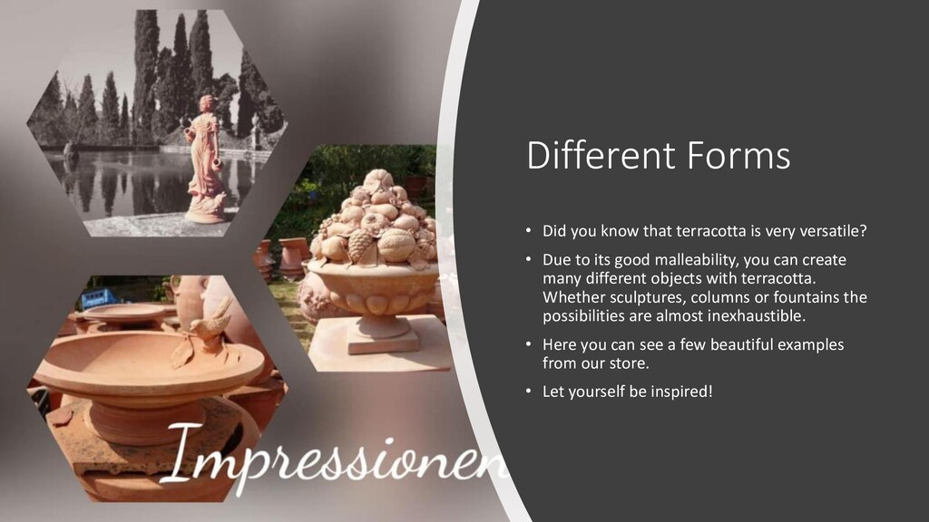 versatile? • Due to its good malleability, you can create many different objects with terracotta. Whether sculptures, columns or fountains the possibilities are almost inexhaustible. • Here you can see a few beautiful examples from our store. • Let yourself be inspired!