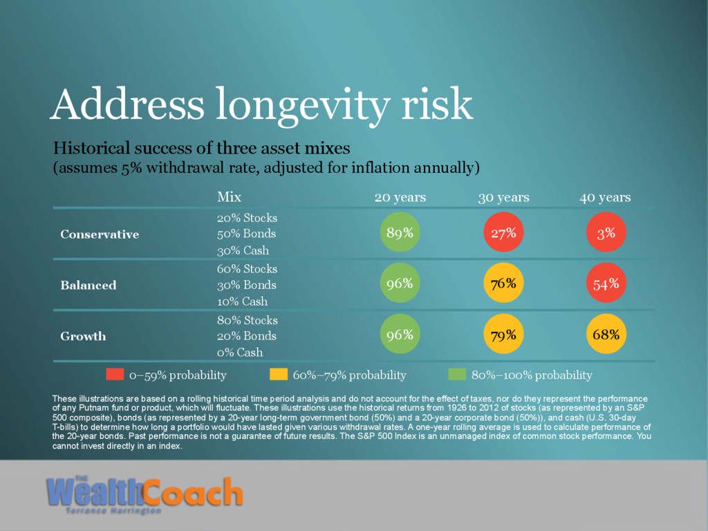 Conservative 20% Stocks 50% Bonds 30% Cash Balanced 60% Stocks 30% Bonds 10% Cash Growth 80% Stocks 20% Bonds 0% Cash Historical success of three asset mixes (assumes 5% withdrawal rate, adjusted for inflation annually) These illustrations are based on a rolling historical time period analysis and do not account for the effect of taxes, nor do they represent the performance of any Putnam fund or product, which will fluctuate. These illustrations use the historical returns from 1926 to 2012 of stocks (as represented by an S&P 500 composite), bonds (as represented by a 20-year long-term government bond (50%) and a 20-year corporate bond (50%)), and cash (U.S. 30-day T-bills) to determine how long a portfolio would have lasted given various withdrawal rates. A one-year rolling average is used to calculate performance of the 20-year bonds. Past performance is not a guarantee of future results. The S&P 500 Index is an unmanaged index of common stock performance. You cannot invest directly in an index. 96% 96% 76% 79% 54% 68% 89% 3% 27% 80%–100% probability 60%–79% probability 0–59% probability