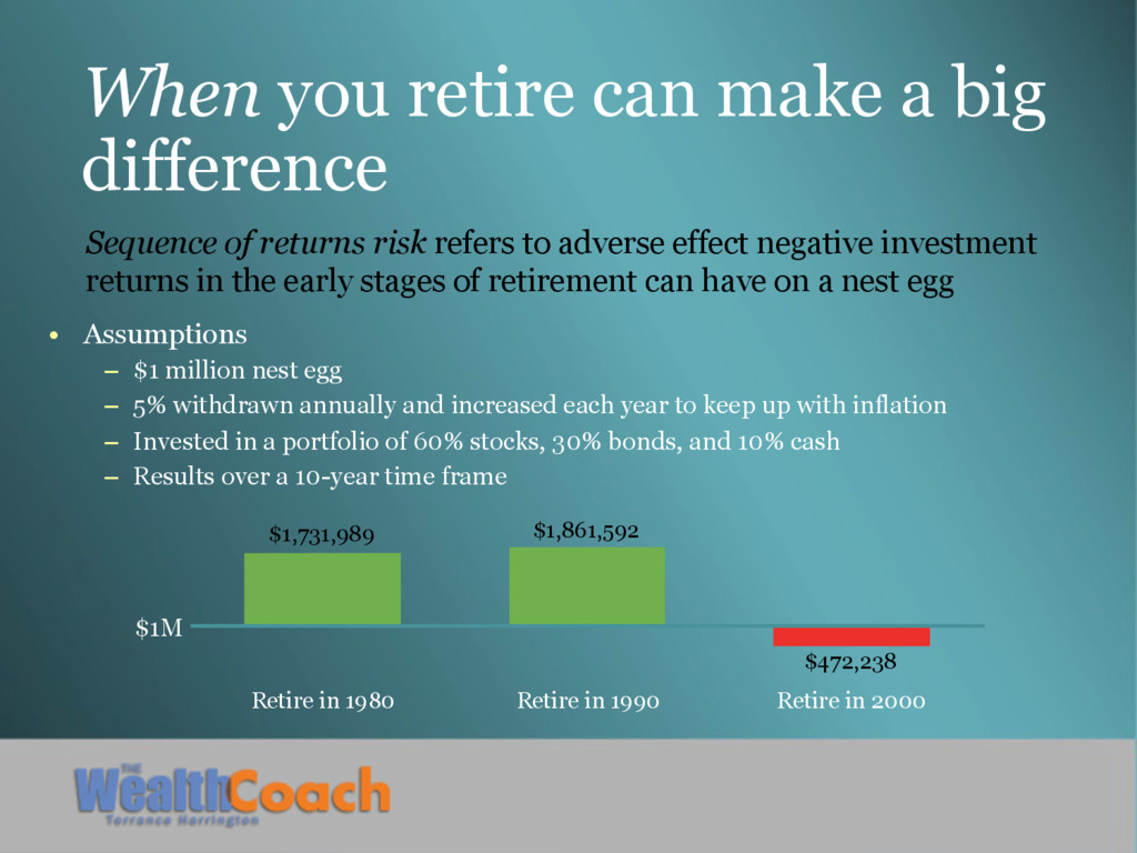 – $1 million nest egg – 5% withdrawn annually and increased each year to keep up with inflation – Invested in a portfolio of 60% stocks, 30% bonds, and 10% cash – Results over a 10-year time frame Sequence of returns risk refers to adverse effect negative investment returns in the early stages of retirement can have on a nest egg Retire in 1980 Retire in 1990 Retire in 2000 $1M $1,731,989 $1,861,592 $472,238
