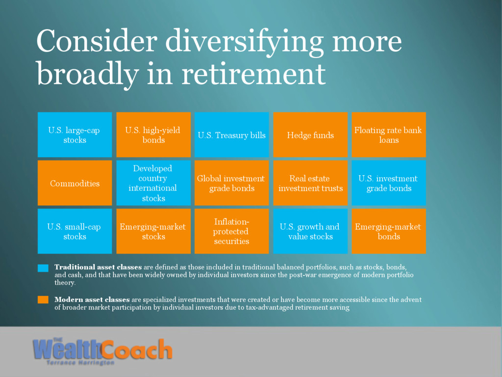 U.S. small-cap stocks U.S. high-yield bonds Developed country international stocks Emerging-market stocks U.S. Treasury bills Global investment grade bonds Inflation- protected securities Hedge funds Real estate investment trusts U.S. growth and value stocks Floating rate bank loans U.S. investment grade bonds Emerging-market bonds Traditional asset classes are defined as those included in traditional balanced portfolios, such as stocks, bonds, and cash, and that have been widely owned by individual investors since the post-war emergence of modern portfolio theory. Modern asset classes are specialized investments that were created or have become more accessible since the advent of broader market participation by individual investors due to tax-advantaged retirement saving
