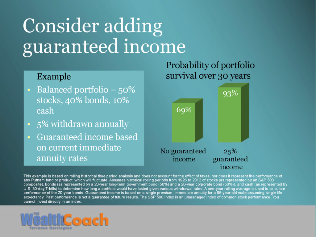 stocks, 40% bonds, 10% cash • 5% withdrawn annually • Guaranteed income based on current immediate annuity rates 69% 93% Probability of portfolio survival over 30 years No guaranteed income 25% guaranteed income This example is based on rolling historical time period analysis and does not account for the effect of taxes, nor does it represent the performance of any Putnam fund or product, which will fluctuate. Assumes historical rolling periods from 1926 to 2012 of stocks (as represented by an S&P 500 composite), bonds (as represented by a 20-year long-term government bond (50%) and a 20-year corporate bond (50%)), and cash (as represented by U.S. 30-day T-bills) to determine how long a portfolio would have lasted given various withdrawal rates. A one-year rolling average is used to calculate performance of the 20-year bonds. Guaranteed income is based on a single premium, immediate annuity for a 65-year-old male assuming single life expectancy. Past performance is not a guarantee of future results. The S&P 500 Index is an unmanaged index of common stock performance. You cannot invest directly in an index.