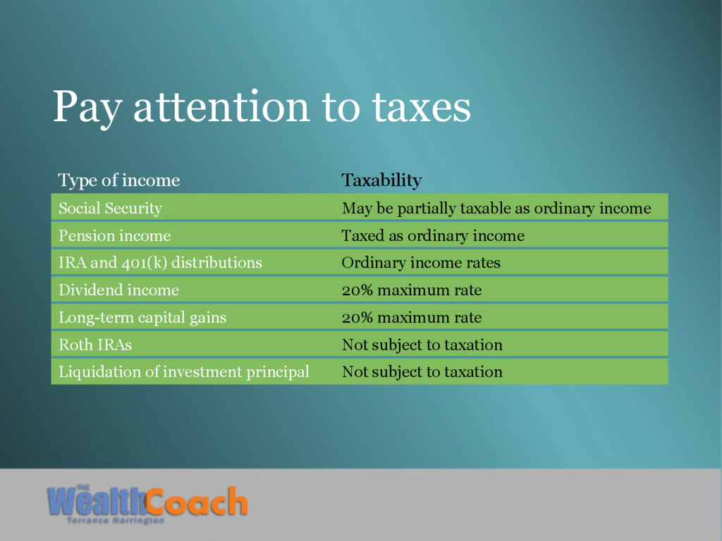 May be partially taxable as ordinary income Pension income Taxed as ordinary income IRA and 401(k) distributions Ordinary income rates Dividend income 20% maximum rate Long-term capital gains 20% maximum rate Roth IRAs Not subject to taxation Liquidation of investment principal Not subject to taxation
