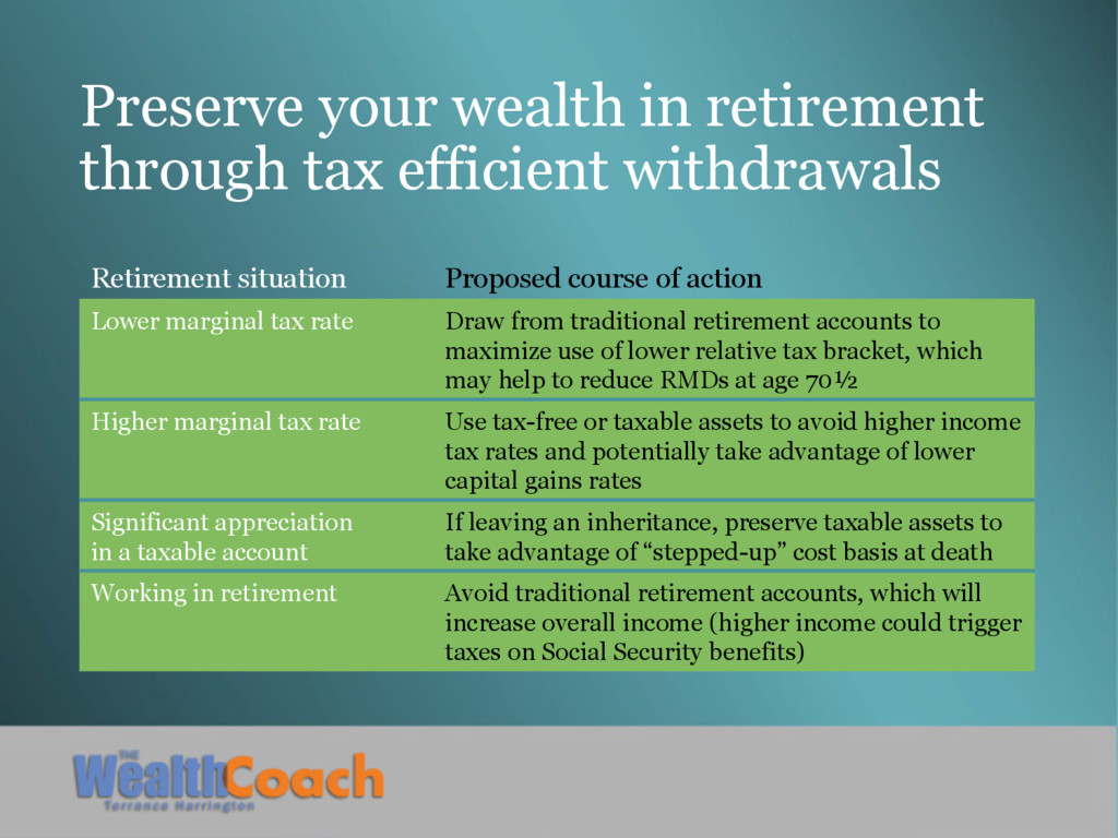 situation Proposed course of action Lower marginal tax rate Draw from traditional retirement accounts to maximize use of lower relative tax bracket, which may help to reduce RMDs at age 70½ Higher marginal tax rate Use tax-free or taxable assets to avoid higher income tax rates and potentially take advantage of lower capital gains rates Significant appreciation in a taxable account If leaving an inheritance, preserve taxable assets to take advantage of “stepped-up” cost basis at death Working in retirement Avoid traditional retirement accounts, which will increase overall income (higher income could trigger taxes on Social Security benefits)