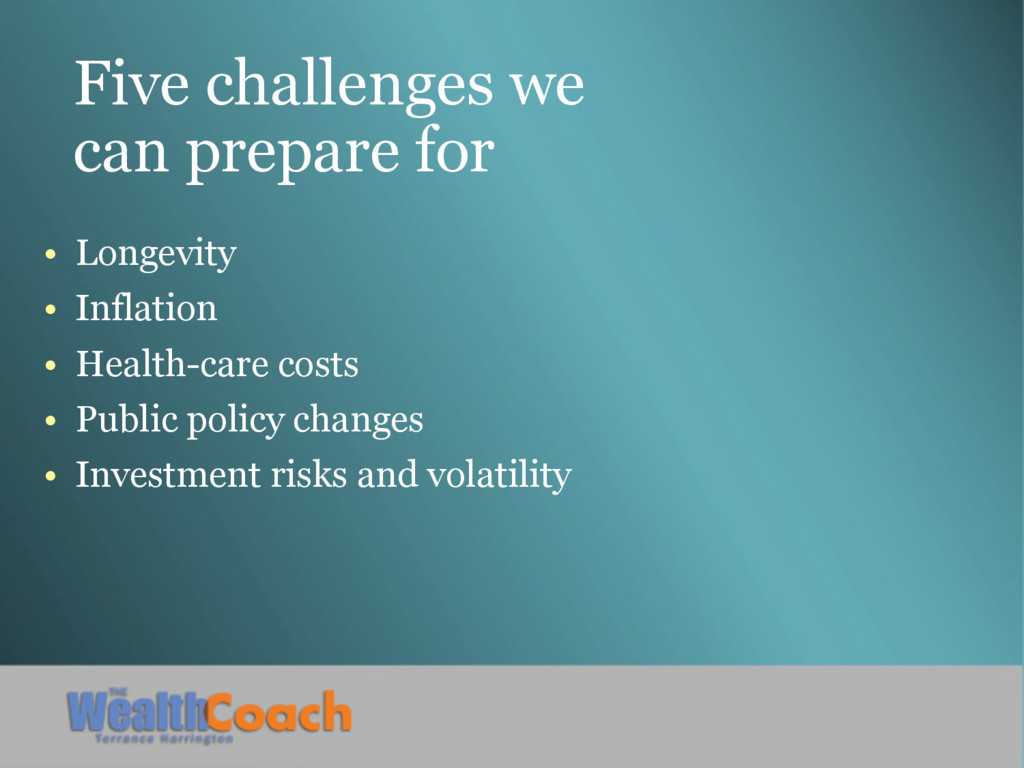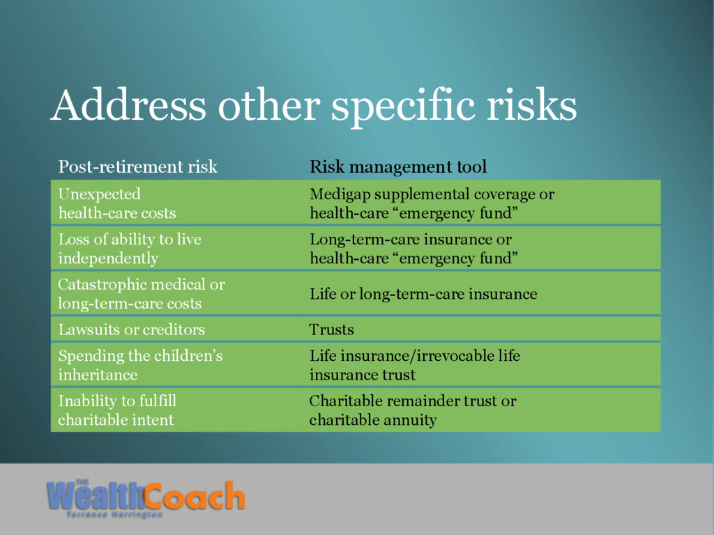 health-care costs Medigap supplemental coverage or health-care “emergency fund” Loss of ability to live independently Long-term-care insurance or health-care “emergency fund” Catastrophic medical or long-term-care costs Life or long-term-care insurance Lawsuits or creditors Trusts Spending the children’s inheritance Life insurance/irrevocable life insurance trust Inability to fulfill charitable intent Charitable remainder trust or charitable annuity