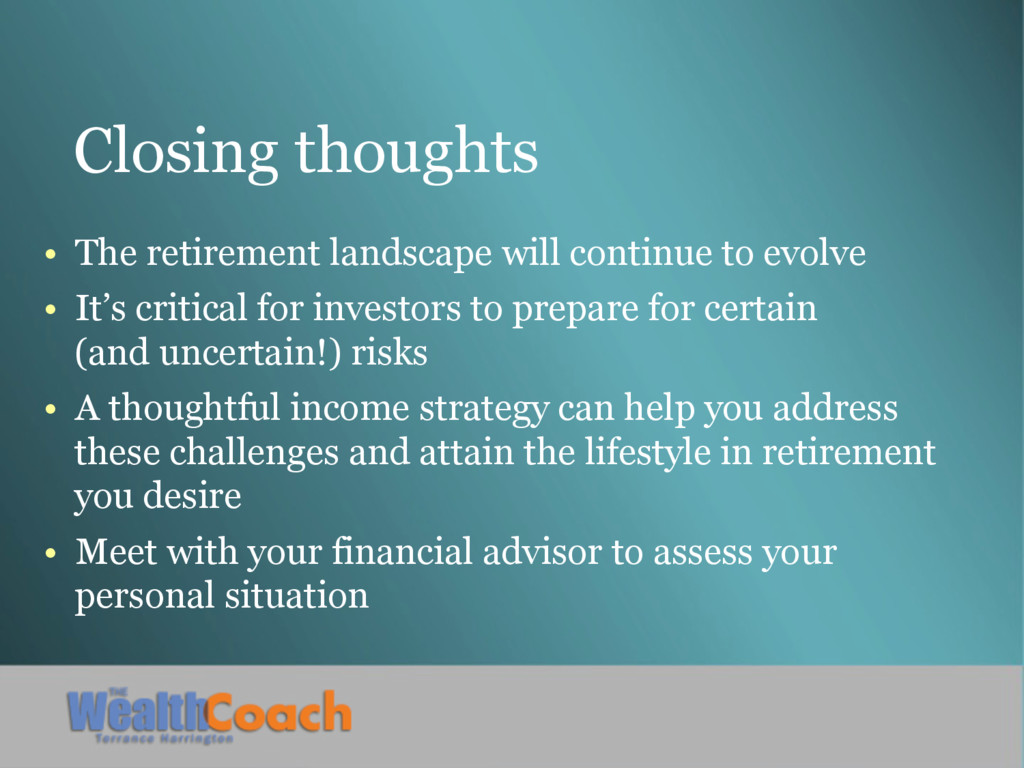 • It’s critical for investors to prepare for certain (and uncertain!) risks • A thoughtful income strategy can help you address these challenges and attain the lifestyle in retirement you desire • Meet with your financial advisor to assess your personal situation