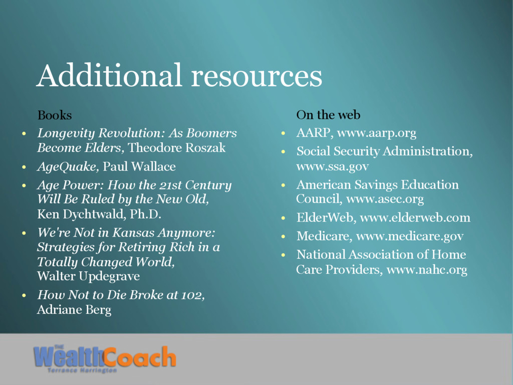 Theodore Roszak • AgeQuake, Paul Wallace • Age Power: How the 21st Century Will Be Ruled by the New Old, Ken Dychtwald, Ph.D. • We're Not in Kansas Anymore: Strategies for Retiring Rich in a Totally Changed World, Walter Updegrave • How Not to Die Broke at 102, Adriane Berg On the web • AARP, www.aarp.org • Social Security Administration, www.ssa.gov • American Savings Education Council, www.asec.org • ElderWeb, www.elderweb.com • Medicare, www.medicare.gov • National Association of Home Care Providers, www.nahc.org