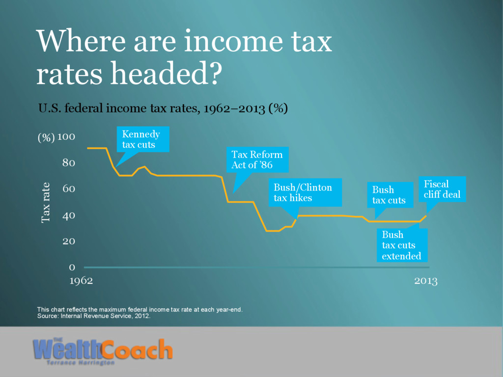 rates headed? This chart reflects the maximum federal income tax rate at each year-end. Source: Internal Revenue Service, 2012. U.S. federal income tax rates, 1962–2013 (%) Tax rate (%) 1962 2013 Kennedy tax cuts Tax Reform Act of ’86 Bush/Clinton tax hikes Bush tax cuts Bush tax cuts extended Fiscal cliff deal
