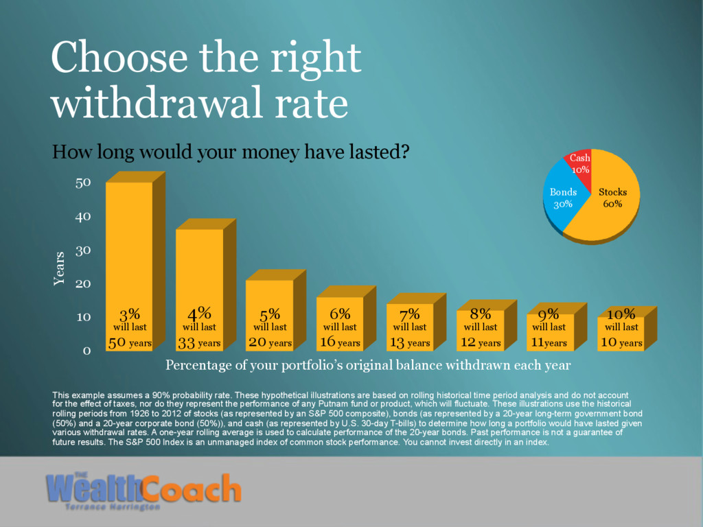 probability rate. These hypothetical illustrations are based on rolling historical time period analysis and do not account for the effect of taxes, nor do they represent the performance of any Putnam fund or product, which will fluctuate. These illustrations use the historical rolling periods from 1926 to 2012 of stocks (as represented by an S&P 500 composite), bonds (as represented by a 20-year long-term government bond (50%) and a 20-year corporate bond (50%)), and cash (as represented by U.S. 30-day T-bills) to determine how long a portfolio would have lasted given various withdrawal rates. A one-year rolling average is used to calculate performance of the 20-year bonds. Past performance is not a guarantee of future results. The S&P 500 Index is an unmanaged index of common stock performance. You cannot invest directly in an index. 0 10 20 30 40 50 Years Percentage of your portfolio’s original balance withdrawn each year How long would your money have lasted? 10% will last 10 years 9% will last 11years 4% will last 33 years 5% will last 20 years 6% will last 16 years 7% will last 13 years 8% will last 12 years 3% will last 50 years Stocks 60% Bonds 30% Cash 10%
