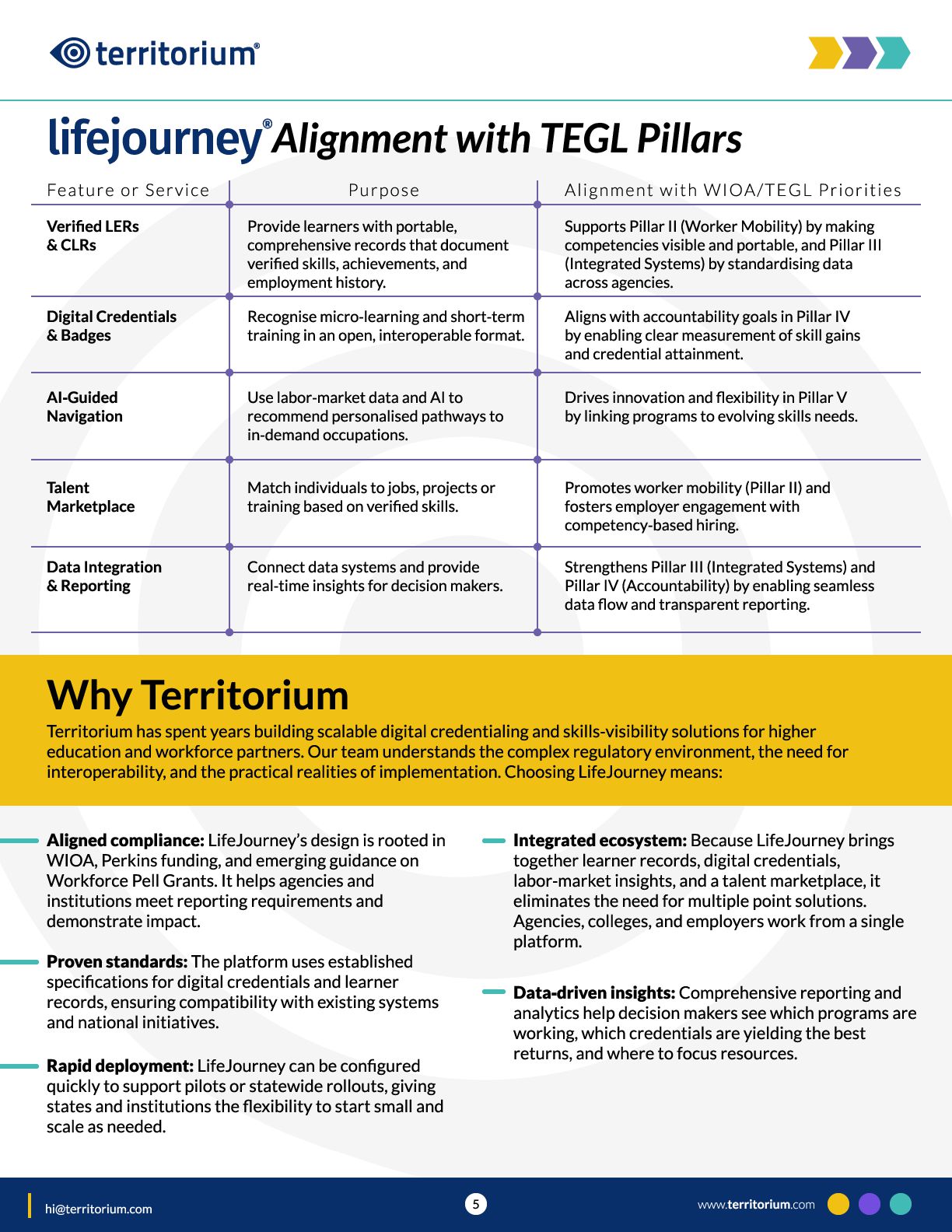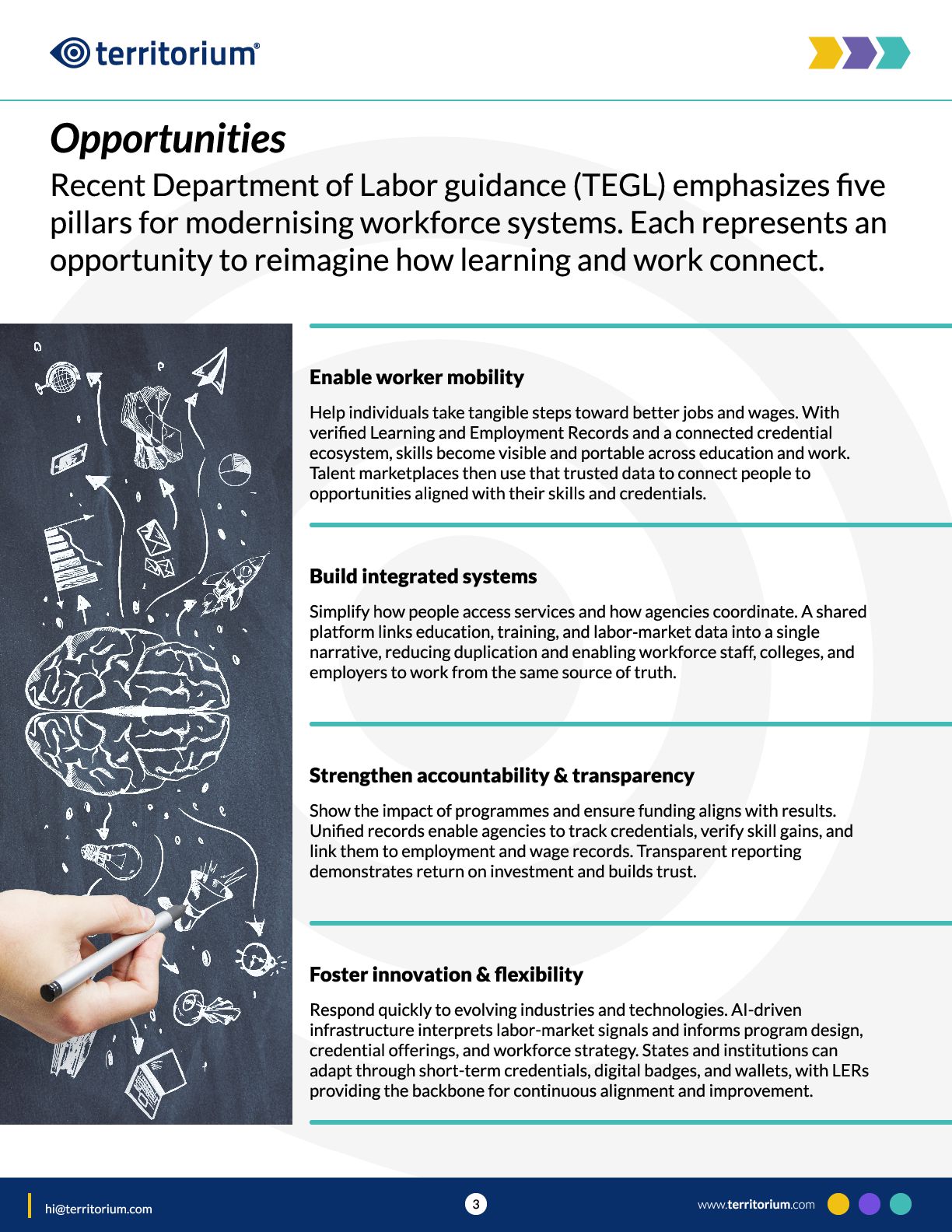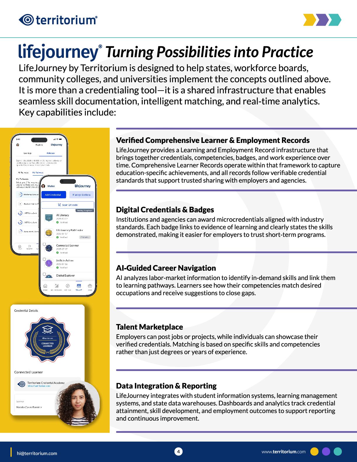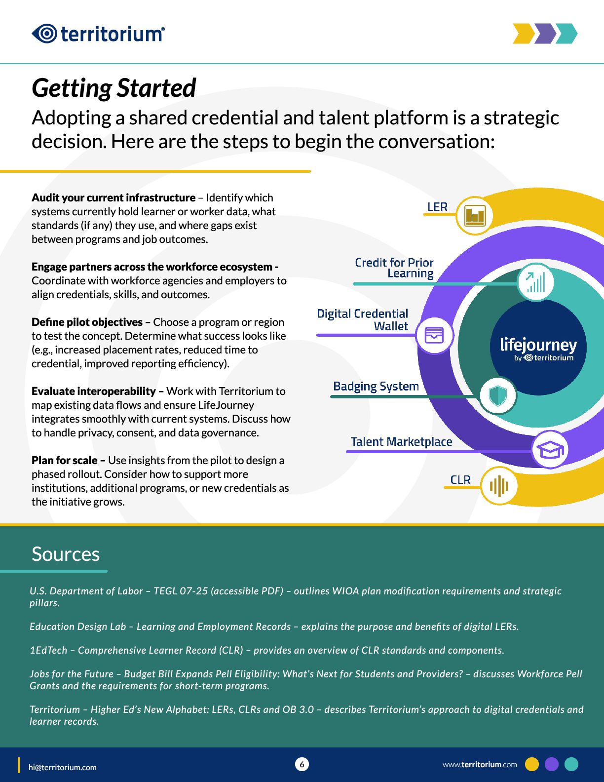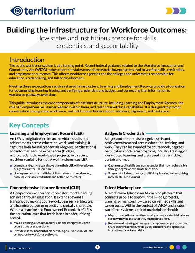 This guide introduces the core components of that infrastructure, including Learning and Employment Records, the role of Comprehensive Learner Records within them, and talent marketplace capabilities. It is designed to prompt conversation among state, workforce, and institutional leaders about readiness, alignment, and next steps. www.territorium.com