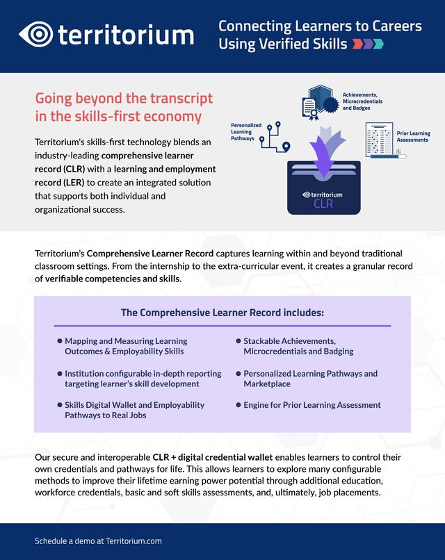 technology blends an industry-leading comprehensive learner record (CLR) with a learning and employment record (LER) to create an integrated solution that supports both individual and organizational success. Territorium’s Comprehensive Learner Record captures learning within and beyond traditional classroom settings. From the internship to the extra-curricular event, it creates a granular record of verifiable competencies and skills. Our secure and interoperable CLR + digital credential wallet enables learners to control their own credentials and pathways for life. This allows learners to explore many configurable methods to improve their lifetime earning power potential through additional education, workforce credentials, basic and soft skills assessments, and, ultimately, job placements. The Comprehensive Learner Record includes: Mapping and Measuring Learning Outcomes & Employability Skills Institution configurable in-depth reporting targeting learner’s skill development P ersonaliz ed Learning P athways and Marketplace Skills D igital W allet and Employability P athways to Real J obs Stackable A chievements, Microcredentials and B adging Engine f or P rior Learning A ssessment Schedule a demo at Territorium.com