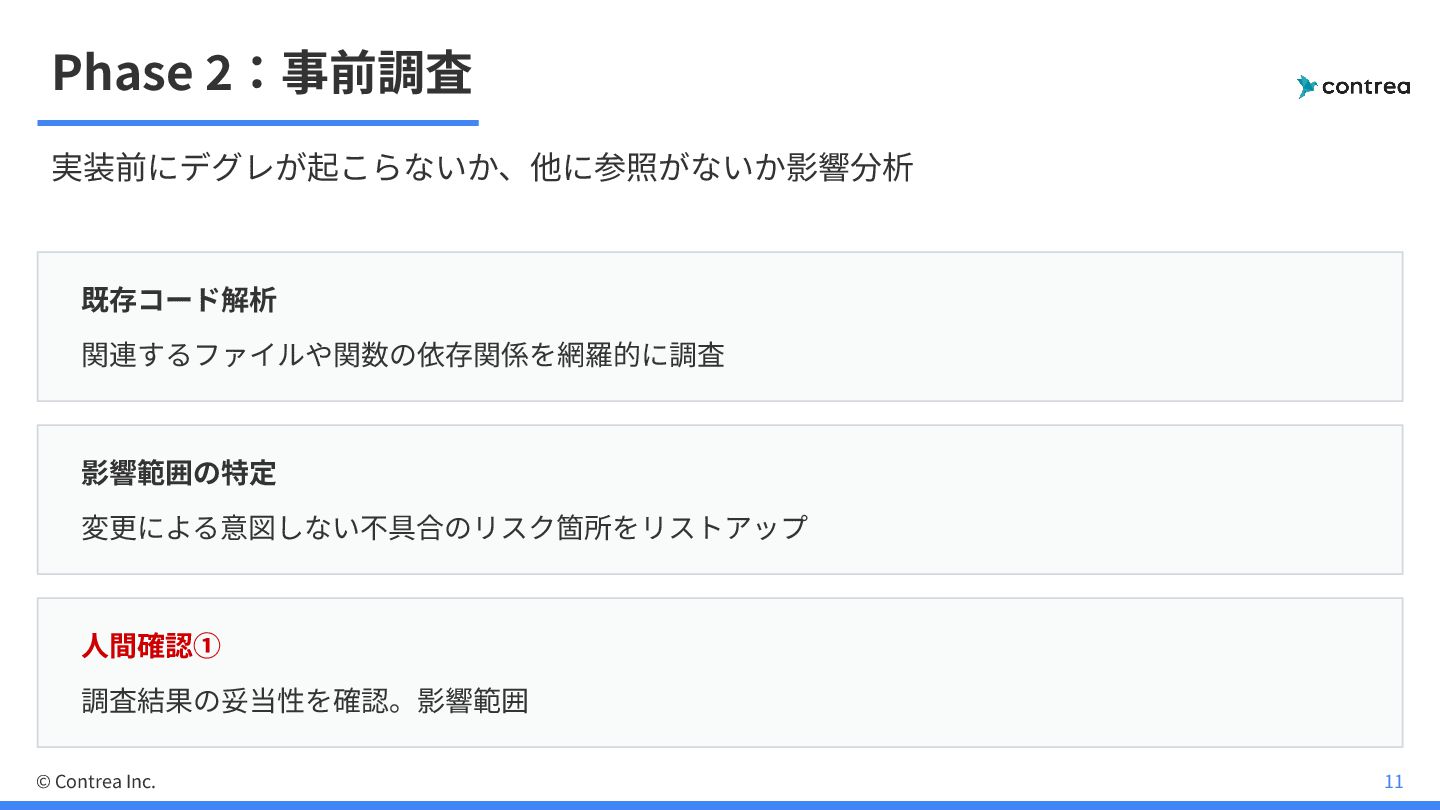 Phase 2:事前調査 実装前にデグレが起こらないか、他に参照がないか影響分析 既存コード解析 関連するファイルや関数の依存関係を網羅的に調査 影響範囲の特定 変更による意図しない不具合のリスク箇所をリストアップ ⼈間確認① 調査結果の妥当性を確認。影響範囲 ©