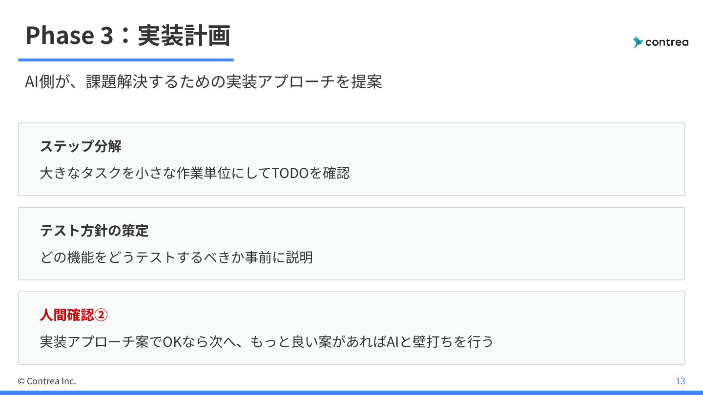 Phase 3:実装計画 AI側が、課題解決するための実装アプローチを提案 ステップ分解 ⼤きなタスクを⼩さな作業単位にしてTODOを確認 テスト⽅針の策定 どの機能をどうテストするべきか事前に説明 ⼈間確認② 実装アプローチ案でOKなら次へ、もっと良い案があればAIと壁打ちを⾏う ©