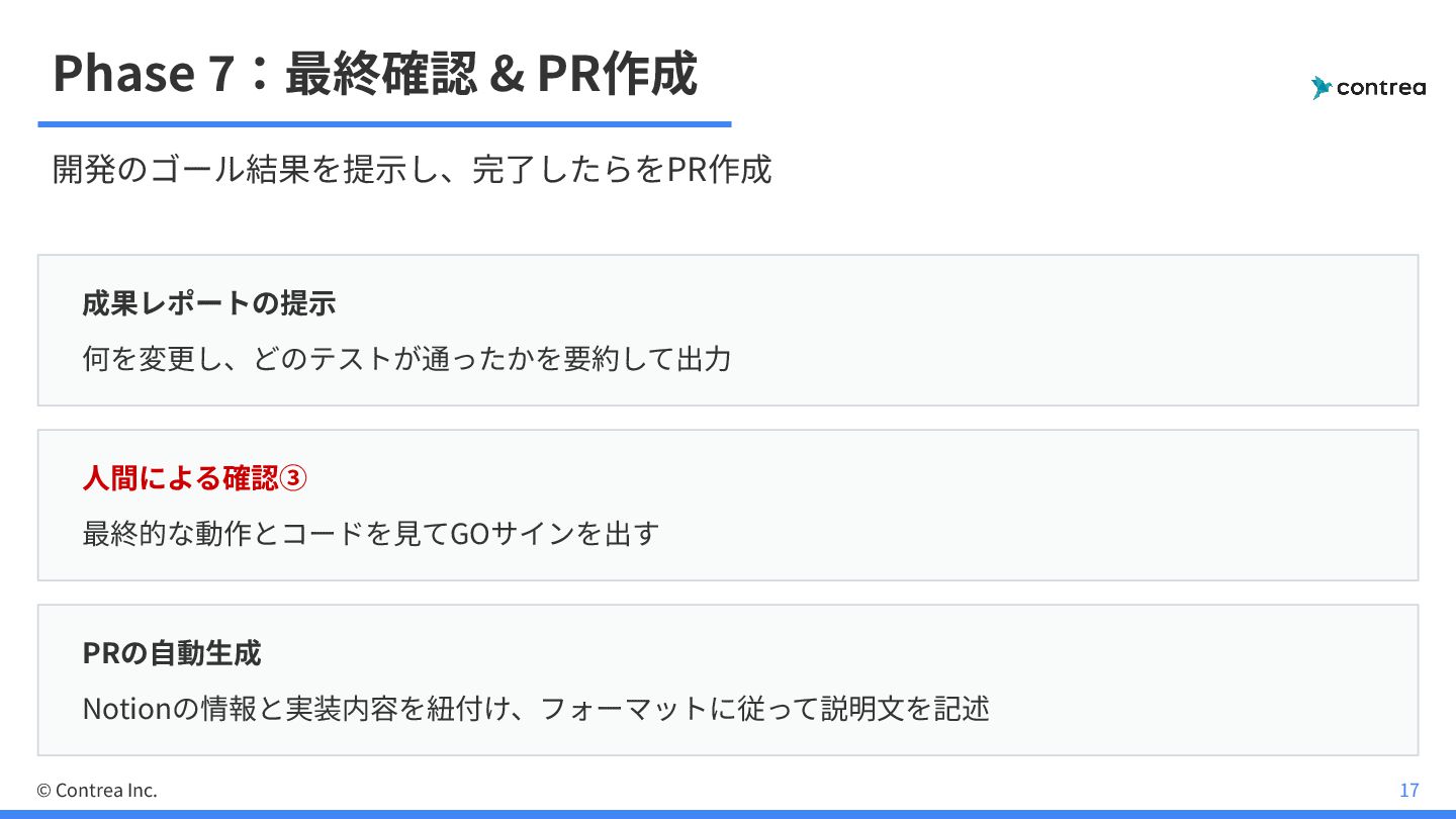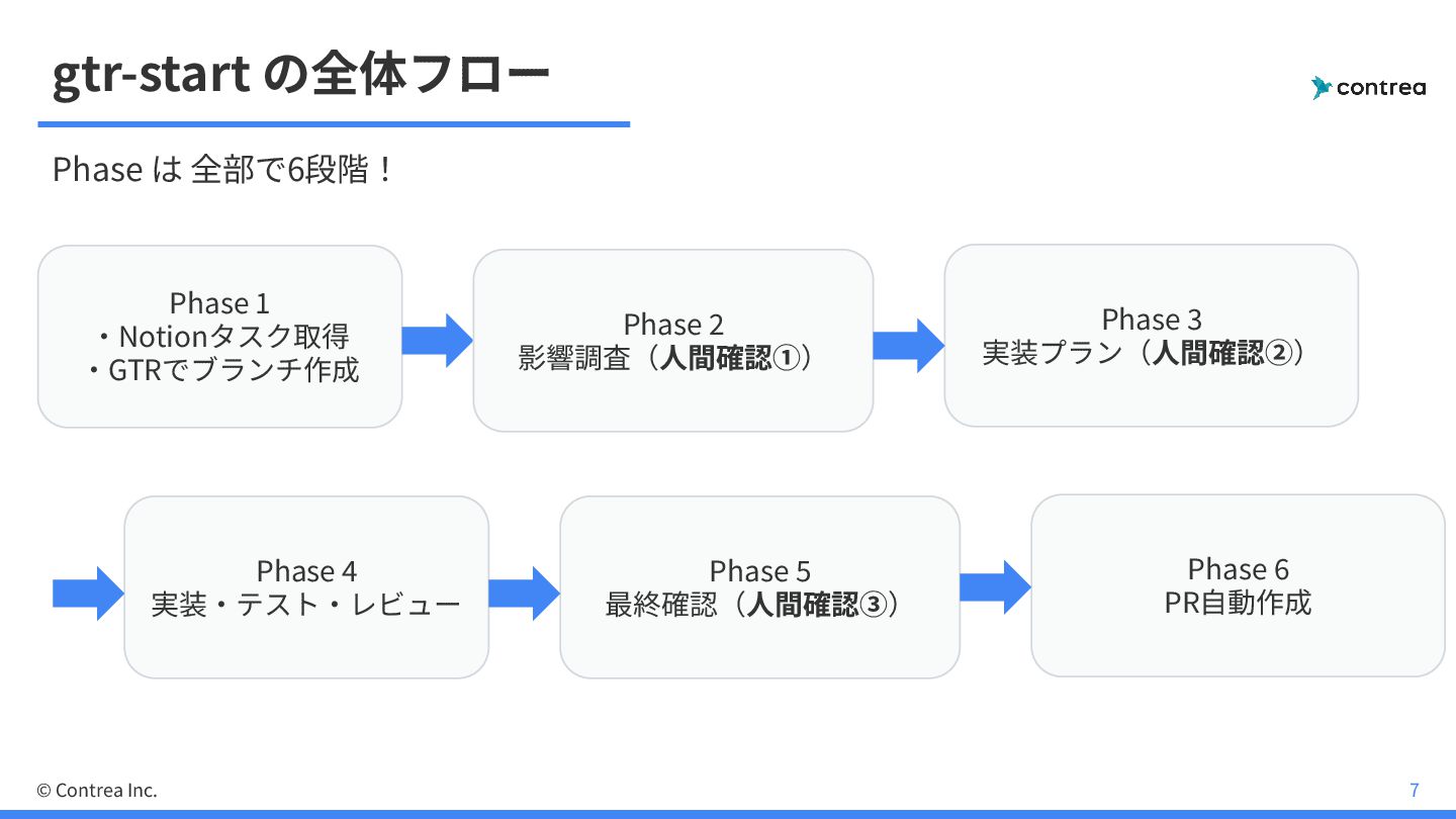 • ただし、全てAIに任せるのは不安... ◦ → ⼈間が確認するPhaseを 3回 挟んだ • 判断以外のルーティンワークはすべてAIに委譲 © Contrea Inc. 6
