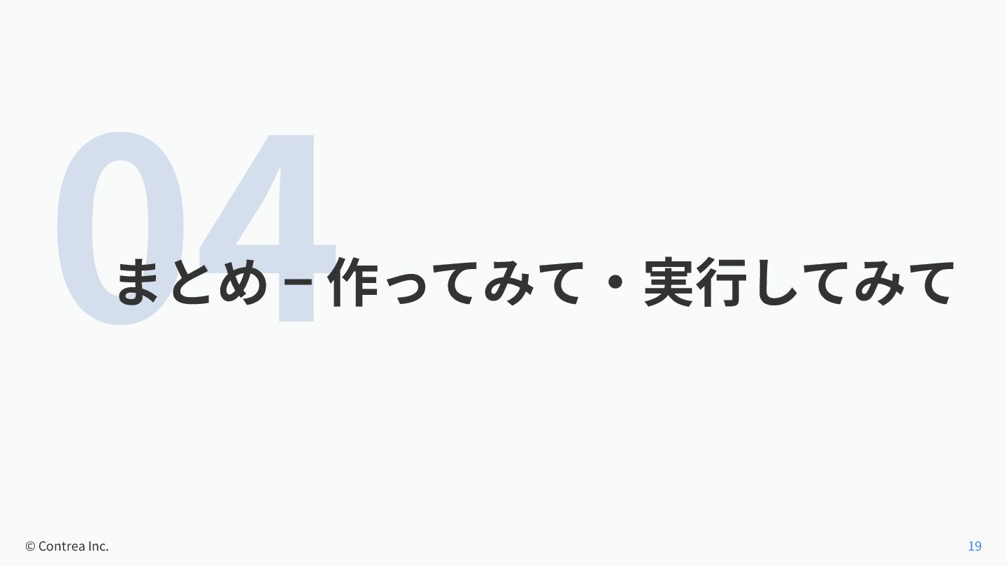 04 まとめ − 作ってみて‧実⾏してみて © Contrea Inc. 19