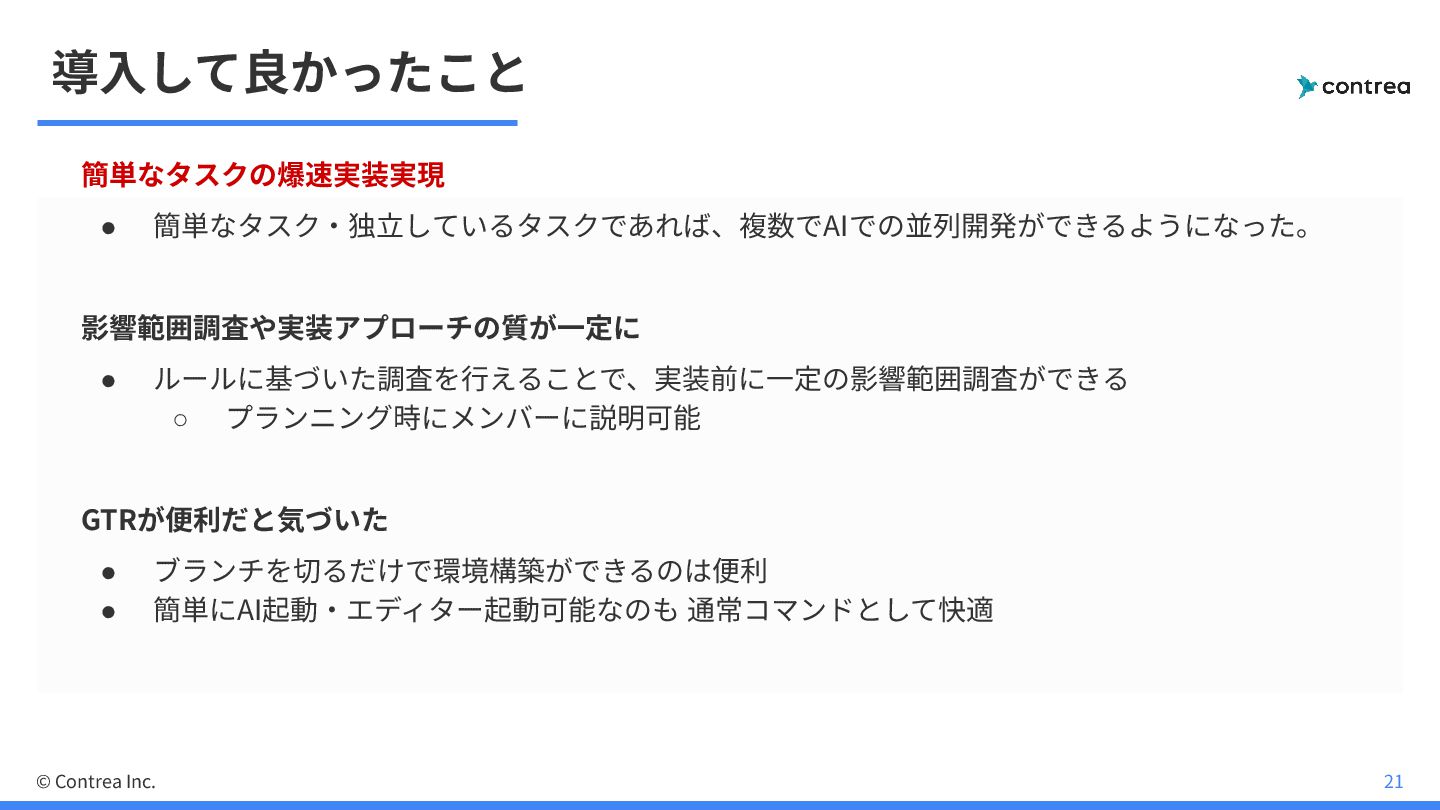 • ブランチを切るだけで環境構築ができるのは便利 • 簡単にAI起動‧エディター起動可能なのも 通常コマンドとして快適 © Contrea Inc. 21