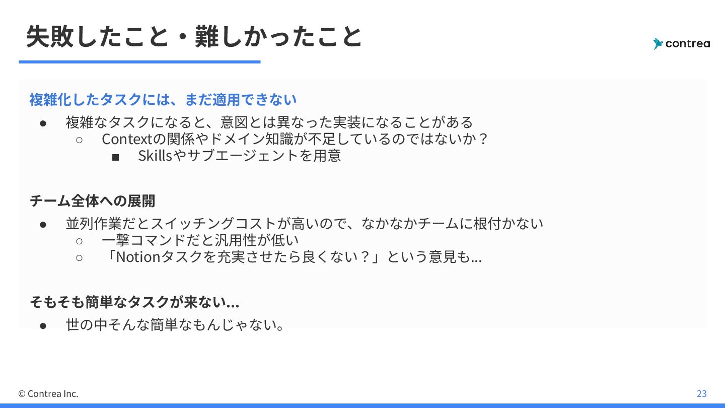並列作業だとスイッチングコストが⾼いので、なかなかチームに根付かない ◦ ⼀撃コマンドだと汎⽤性が低い ◦ 「Notionタスクを充実させたら良くない?」という意⾒も... そもそも簡単なタスクが来ない... • 世の中そんな簡単なもんじゃない。 © Contrea Inc. 23