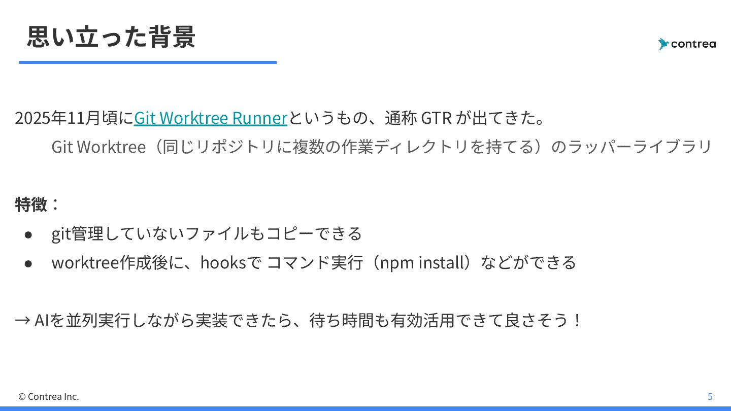 思い⽴った背景 2025年11⽉頃にGit Worktree Runnerというもの、通称 GTR が出てきた。 Git Worktree(同じリポジトリに複数の作業ディレクトリを持てる)のラッパーライブラリ 特徴: •
