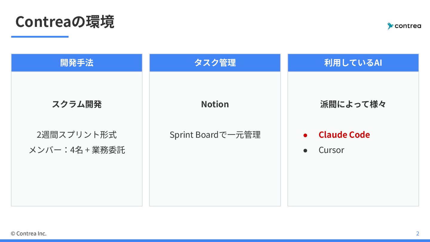 Contreaの環境 開発⼿法 スクラム開発 2週間スプリント形式 メンバー:4名 + 業務委託 タスク管理 Notion Sprint