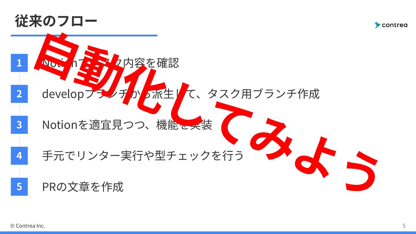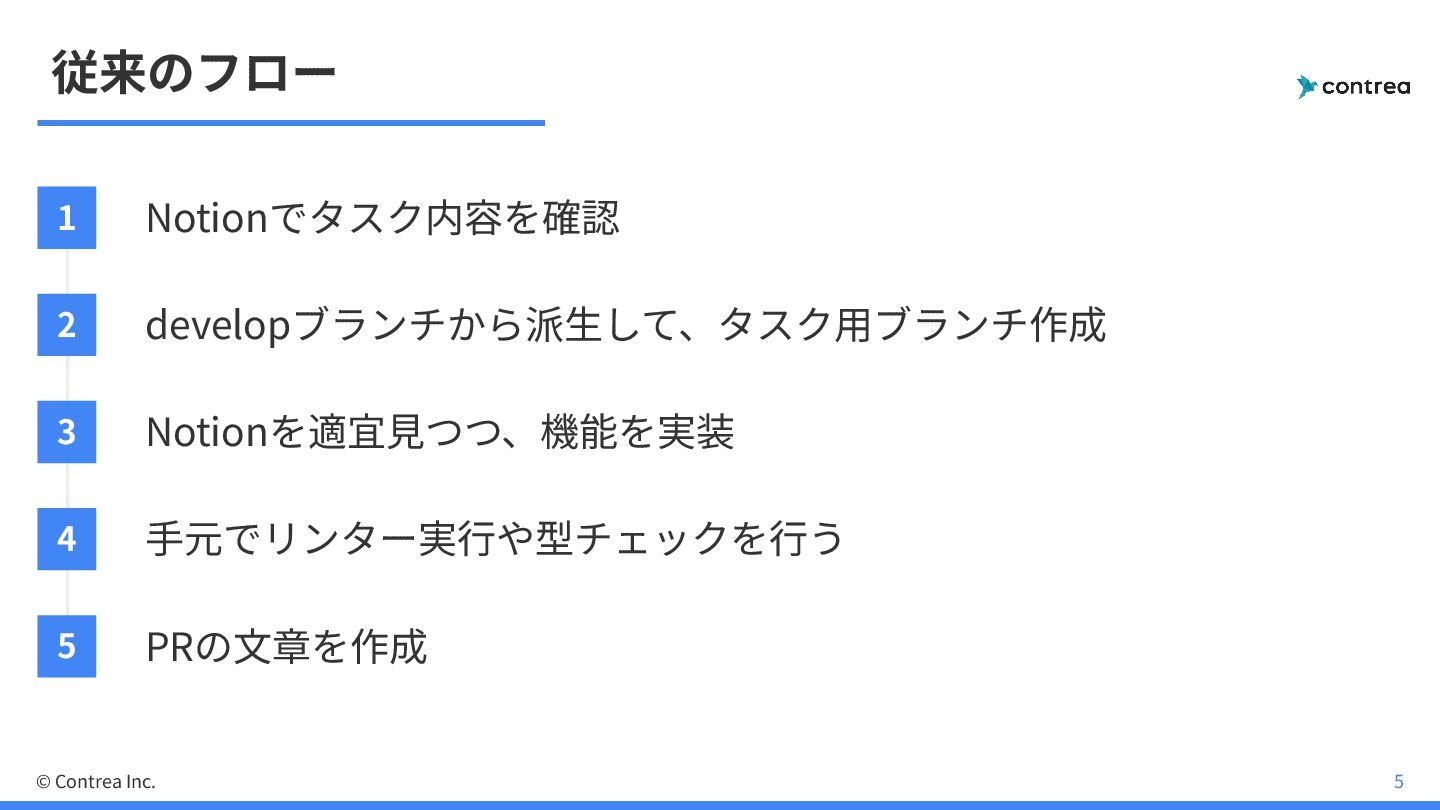 従来のフロー 1 Notionでタスク内容を確認 2 developブランチから派⽣して、タスク⽤ブランチ作成 3 Notionを適宜⾒つつ、機能を実装 4 ⼿元でリンター実⾏や型チェックを⾏う 5