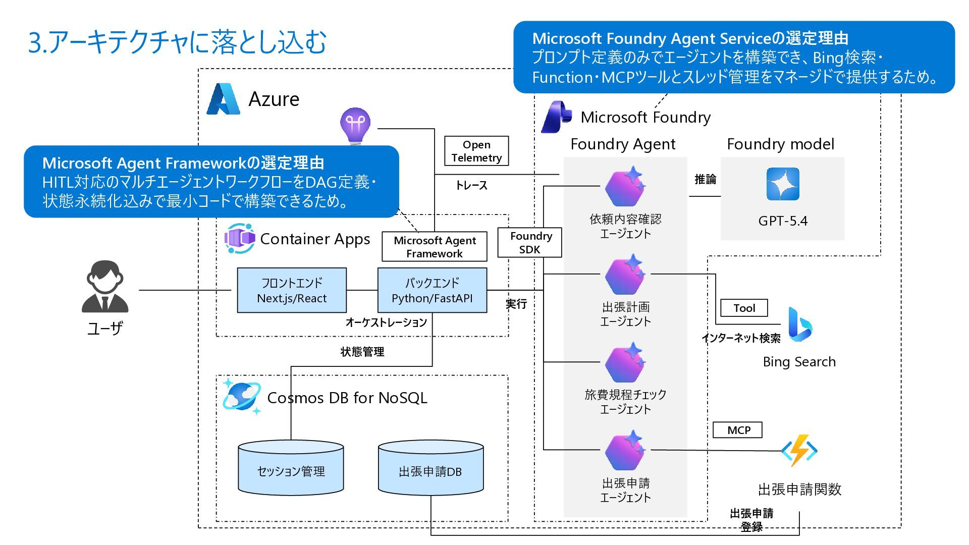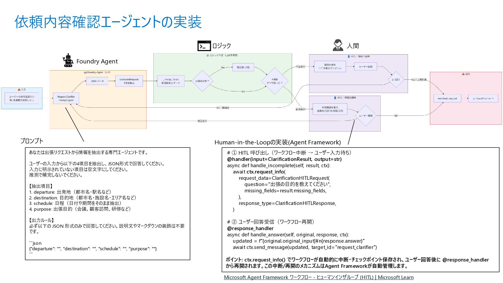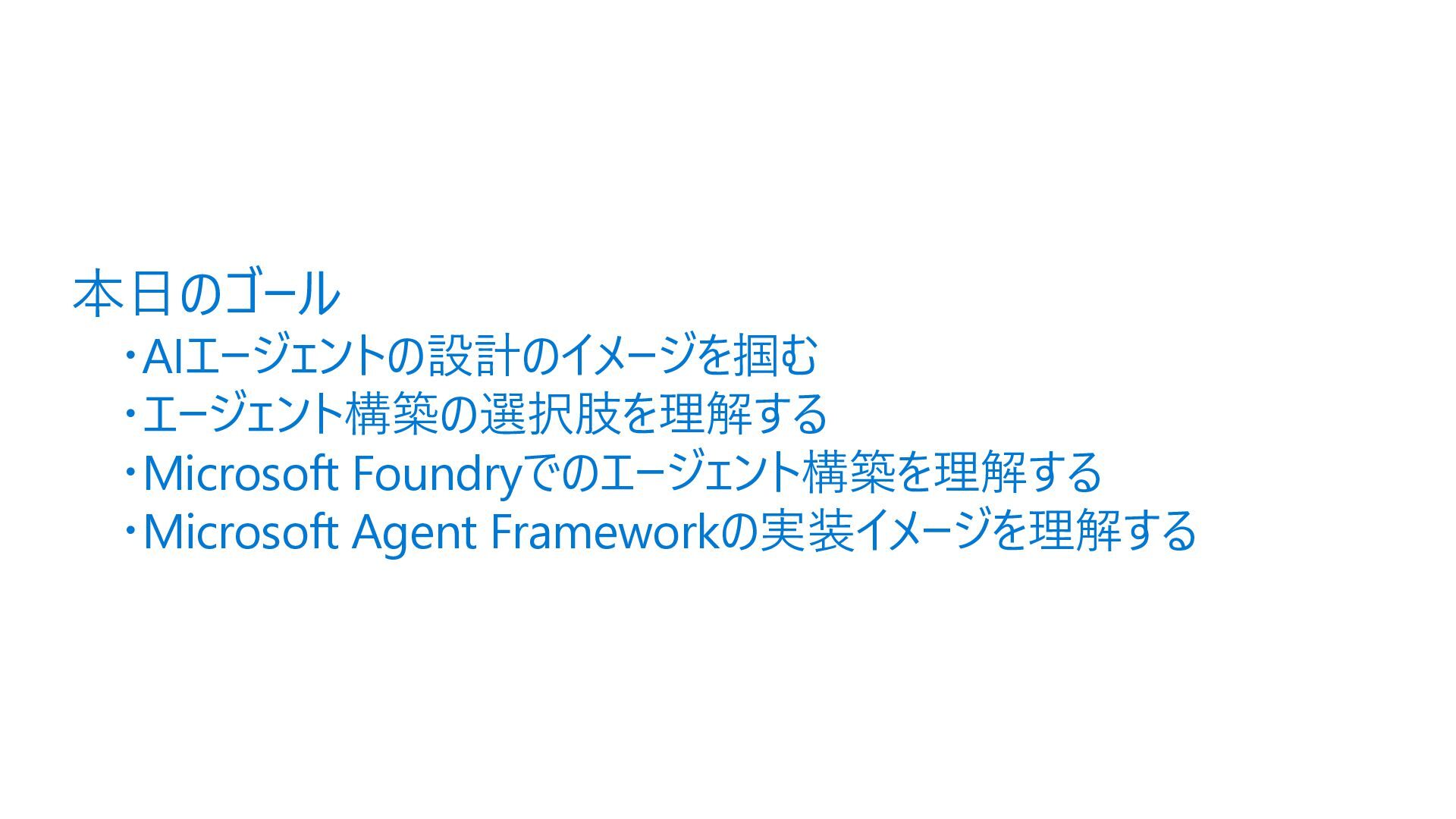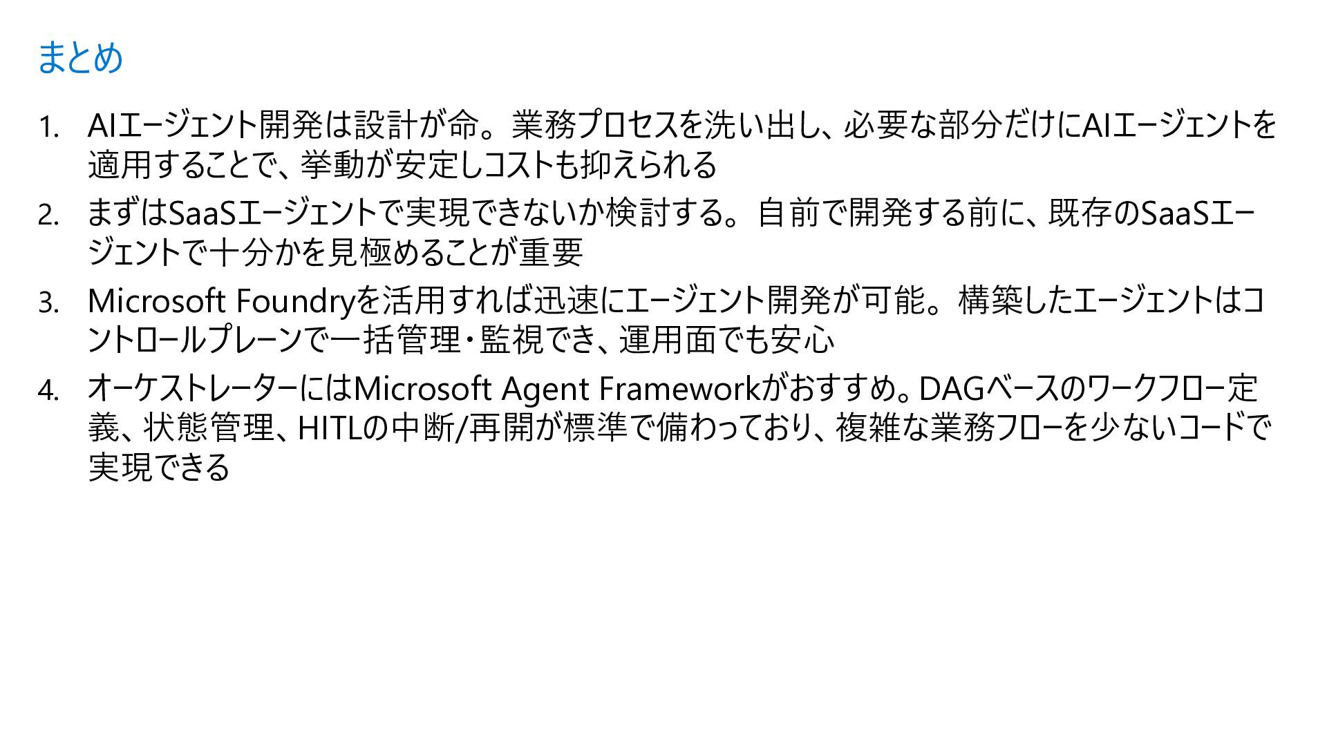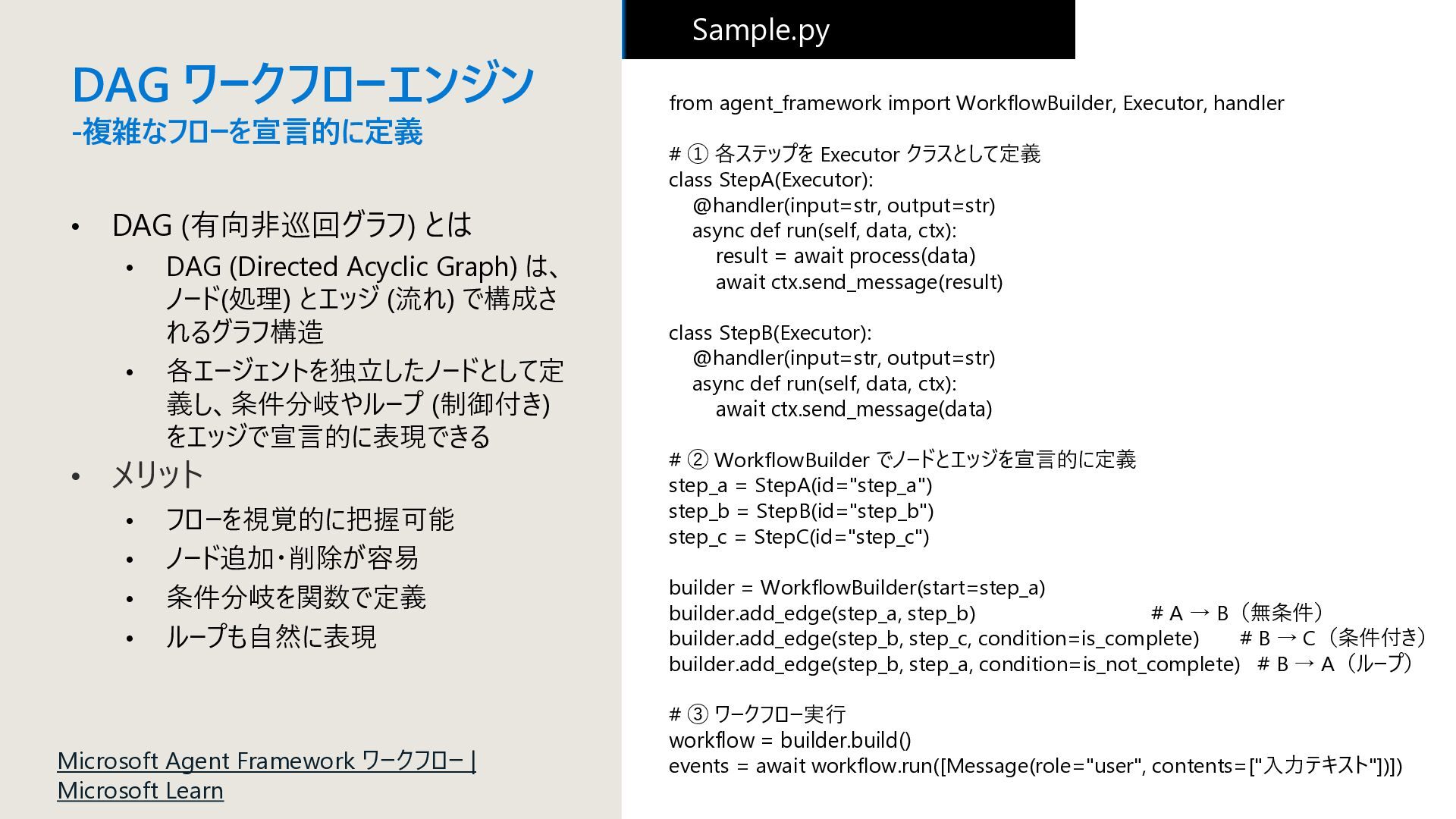 Acyclic Graph) は、 ノード(処理) とエッジ (流れ) で構成さ れるグラフ構造 • 各エージェントを独立したノードとして定 義し、条件分岐やループ (制御付き) をエッジで宣言的に表現できる • メリット • フローを視覚的に把握可能 • ノード追加・削除が容易 • 条件分岐を関数で定義 • ループも自然に表現 Sample.py from agent_framework import WorkflowBuilder, Executor, handler # ① 各ステップを Executor クラスとして定義 class StepA(Executor): @handler(input=str, output=str) async def run(self, data, ctx): result = await process(data) await ctx.send_message(result) class StepB(Executor): @handler(input=str, output=str) async def run(self, data, ctx): await ctx.send_message(data) # ② WorkflowBuilder でノードとエッジを宣言的に定義 step_a = StepA(id="step_a") step_b = StepB(id="step_b") step_c = StepC(id="step_c") builder = WorkflowBuilder(start=step_a) builder.add_edge(step_a, step_b) # A → B(無条件) builder.add_edge(step_b, step_c, condition=is_complete) # B → C(条件付き) builder.add_edge(step_b, step_a, condition=is_not_complete) # B → A(ループ) # ③ ワークフロー実行 workflow = builder.build() events = await workflow.run([Message(role="user", contents=["入力テキスト"])]) Microsoft Agent Framework ワークフロー | Microsoft Learn