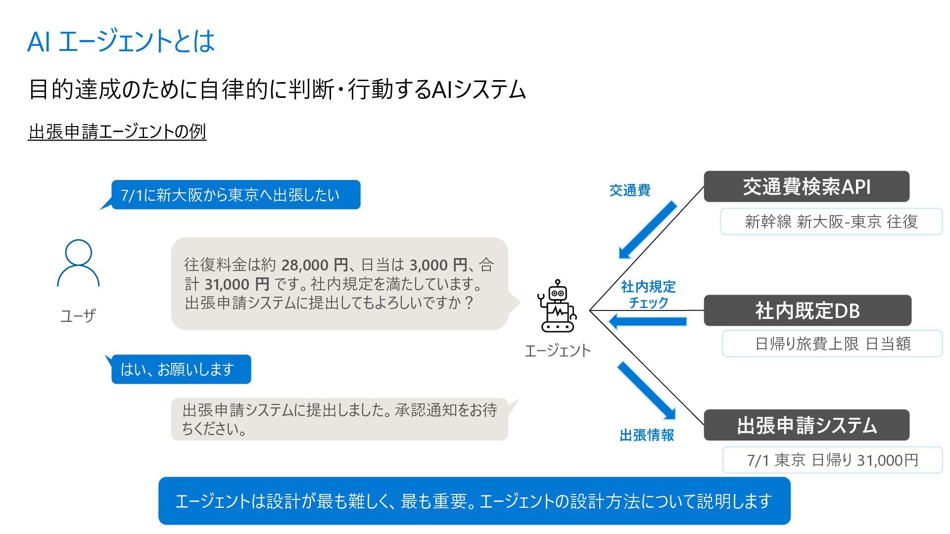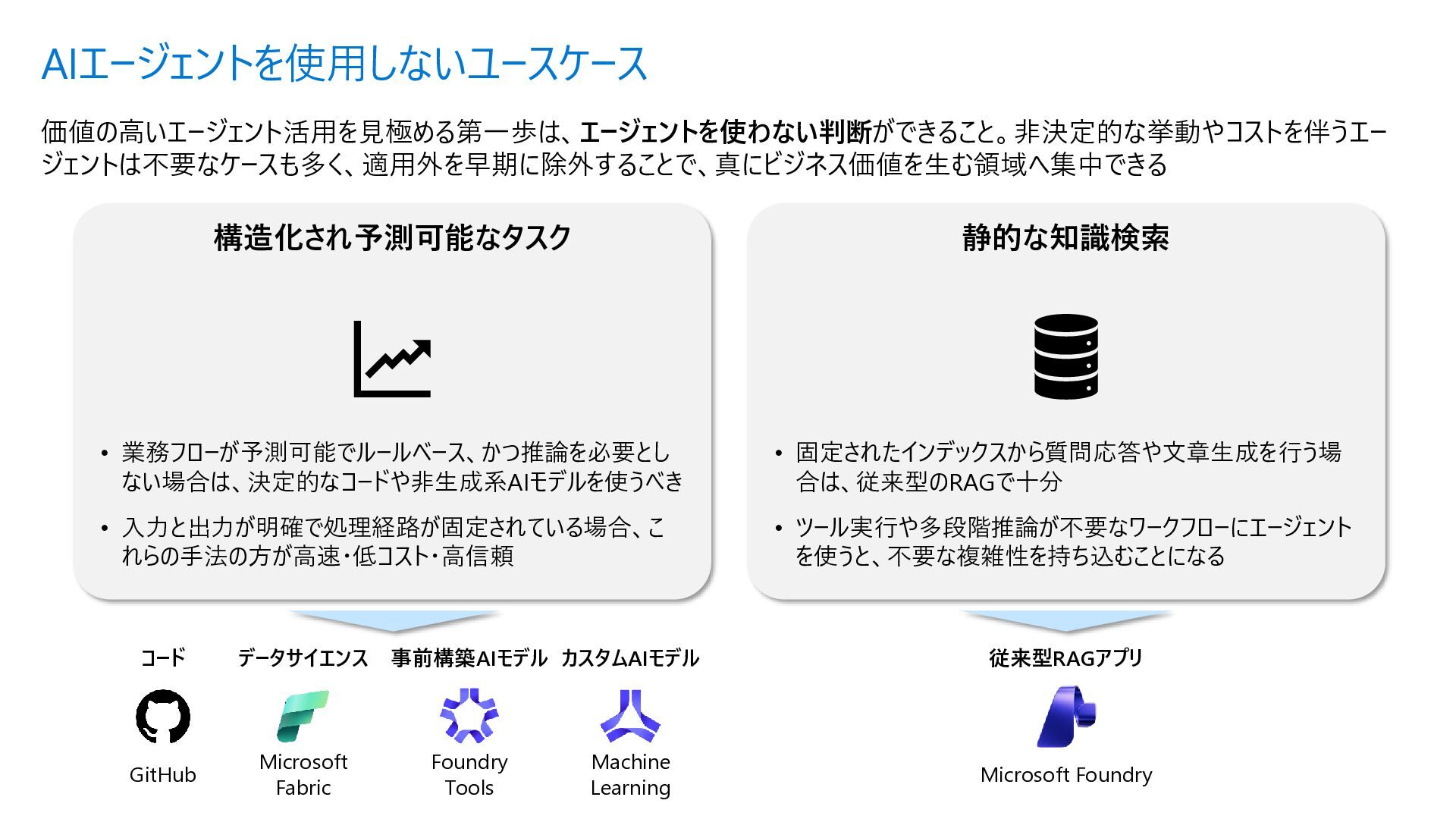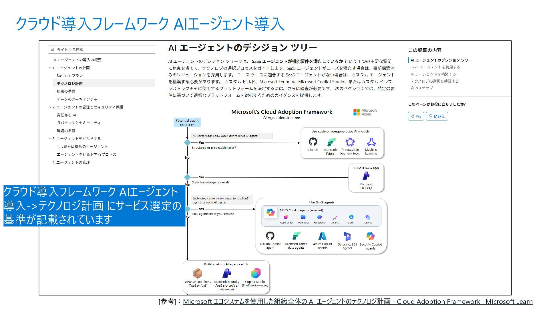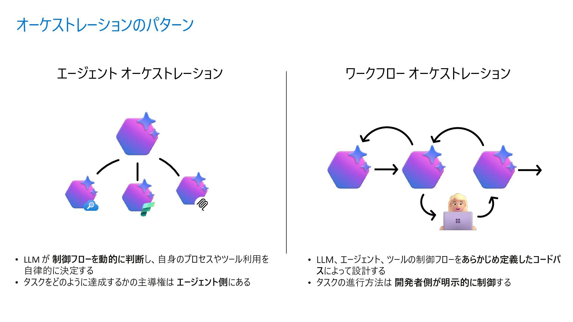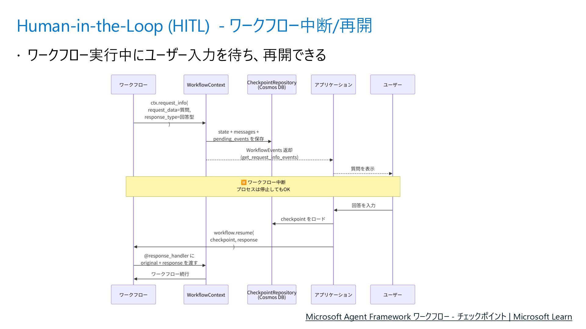 Acyclic Graph) は、 ノード(処理) とエッジ (流れ) で構成さ れるグラフ構造 • 各エージェントを独立したノードとして定 義し、条件分岐やループ (制御付き) をエッジで宣言的に表現できる • メリット • フローを視覚的に把握可能 • ノード追加・削除が容易 • 条件分岐を関数で定義 • ループも自然に表現 Sample.py from agent_framework import WorkflowBuilder, Executor, handler # ① 各ステップを Executor クラスとして定義 class StepA(Executor): @handler(input=str, output=str) async def run(self, data, ctx): result = await process(data) await ctx.send_message(result) class StepB(Executor): @handler(input=str, output=str) async def run(self, data, ctx): await ctx.send_message(data) # ② WorkflowBuilder でノードとエッジを宣言的に定義 step_a = StepA(id="step_a") step_b = StepB(id="step_b") step_c = StepC(id="step_c") builder = WorkflowBuilder(start=step_a) builder.add_edge(step_a, step_b) # A → B(無条件) builder.add_edge(step_b, step_c, condition=is_complete) # B → C(条件付き) builder.add_edge(step_b, step_a, condition=is_not_complete) # B → A(ループ) # ③ ワークフロー実行 workflow = builder.build() events = await workflow.run([Message(role="user", contents=["入力テキスト"])]) Microsoft Agent Framework ワークフロー | Microsoft Learn