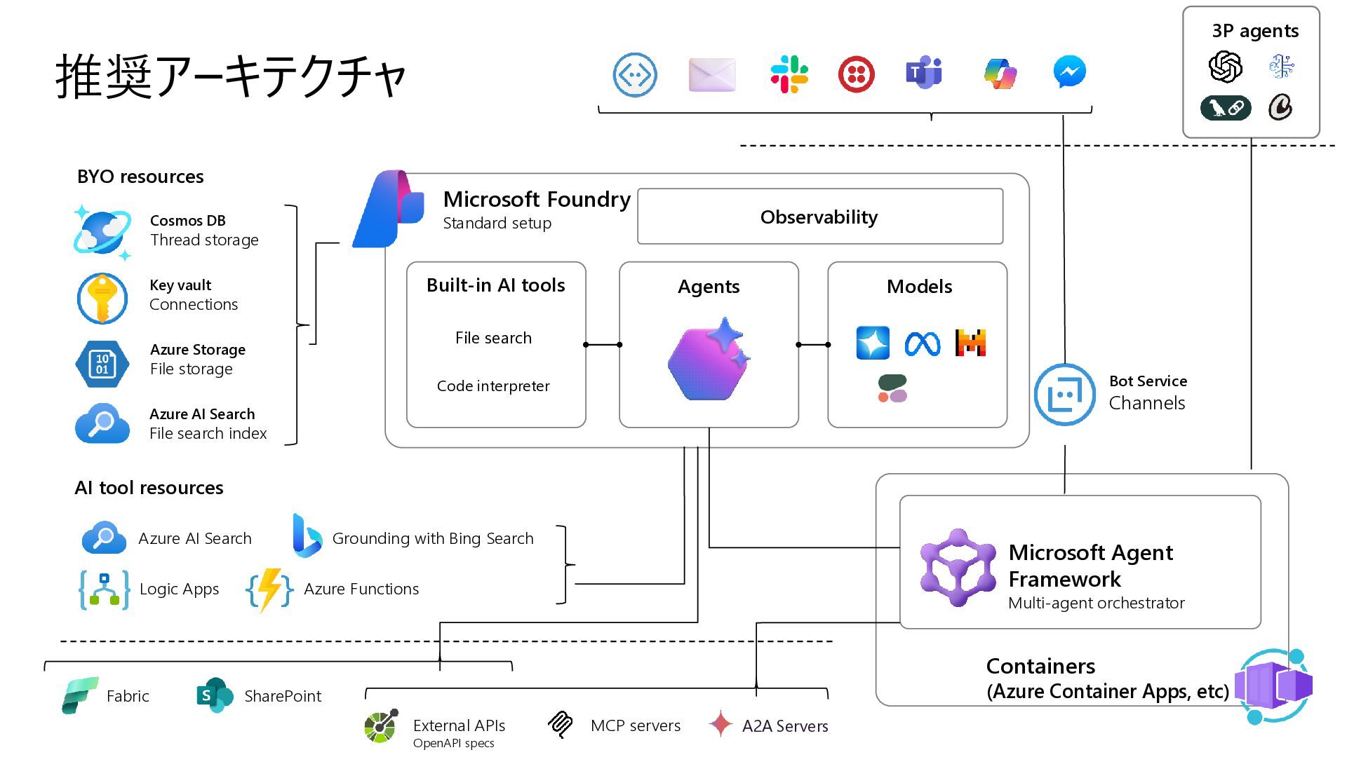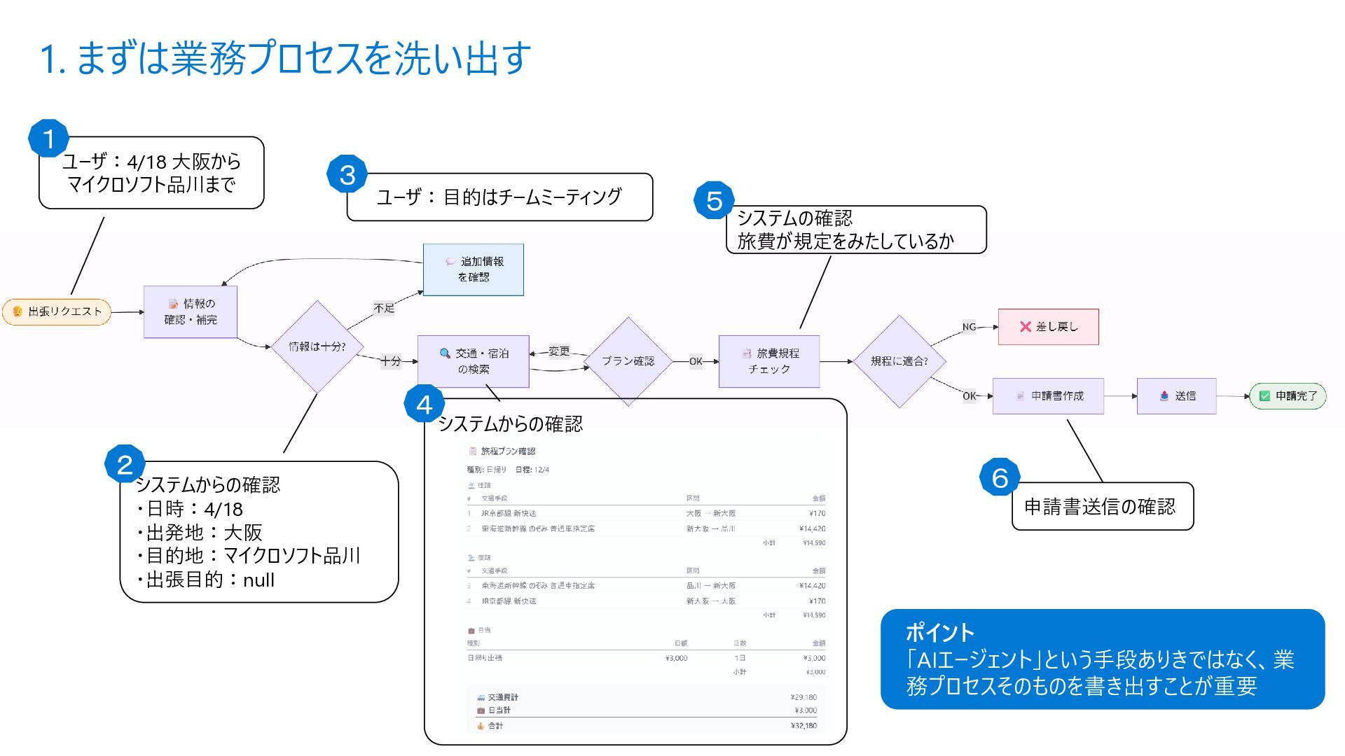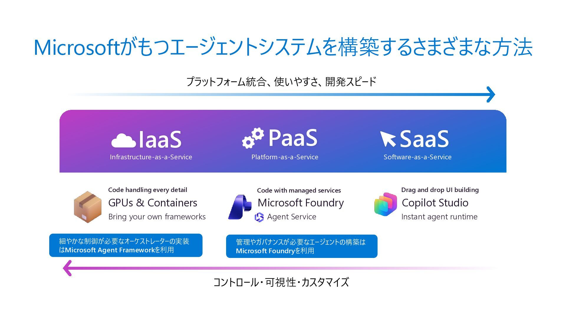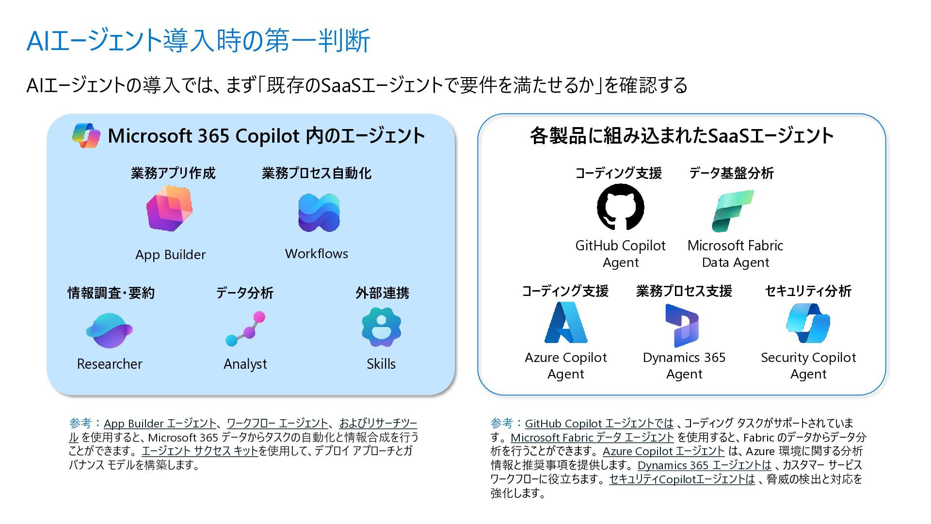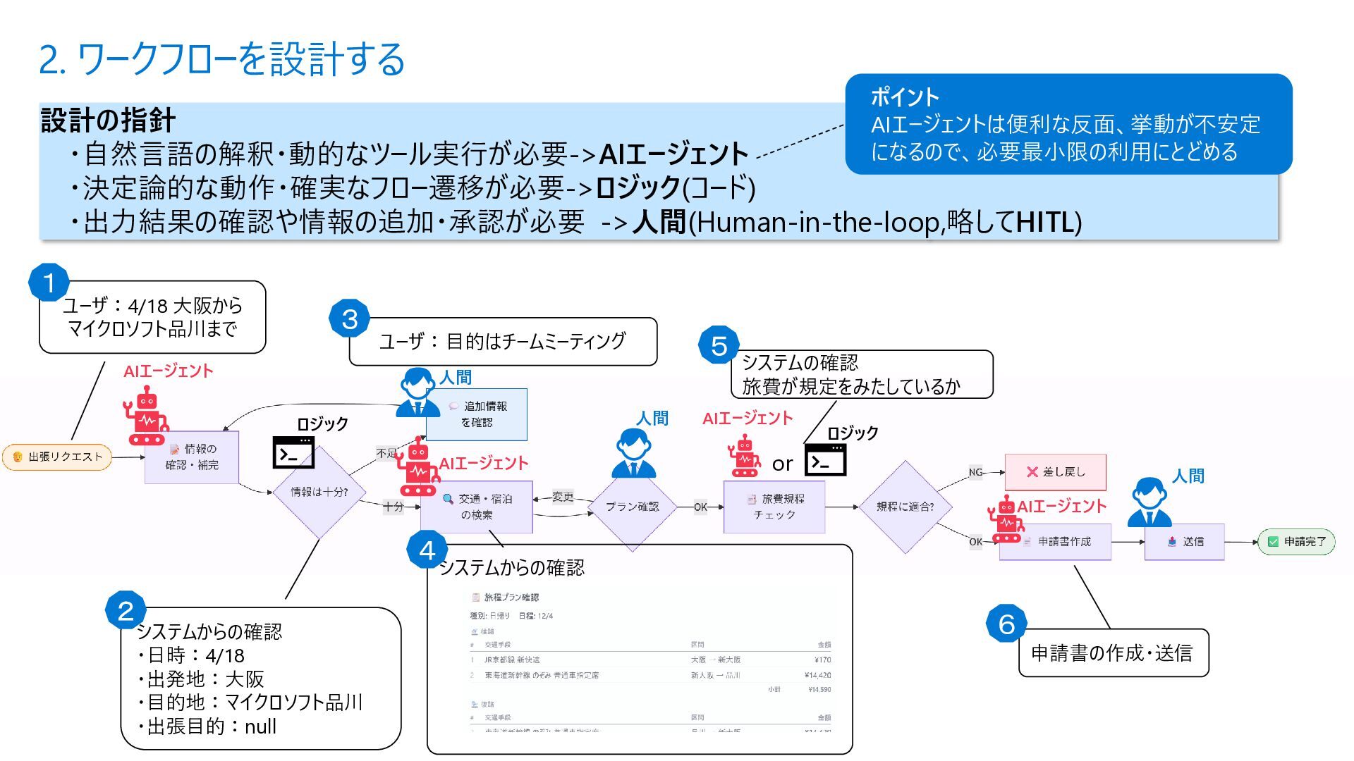 Acyclic Graph) は、 ノード(処理) とエッジ (流れ) で構成さ れるグラフ構造 • 各エージェントを独立したノードとして定 義し、条件分岐やループ (制御付き) をエッジで宣言的に表現できる • メリット • フローを視覚的に把握可能 • ノード追加・削除が容易 • 条件分岐を関数で定義 • ループも自然に表現 Sample.py from agent_framework import WorkflowBuilder, Executor, handler # ① 各ステップを Executor クラスとして定義 class StepA(Executor): @handler(input=str, output=str) async def run(self, data, ctx): result = await process(data) await ctx.send_message(result) class StepB(Executor): @handler(input=str, output=str) async def run(self, data, ctx): await ctx.send_message(data) # ② WorkflowBuilder でノードとエッジを宣言的に定義 step_a = StepA(id="step_a") step_b = StepB(id="step_b") step_c = StepC(id="step_c") builder = WorkflowBuilder(start=step_a) builder.add_edge(step_a, step_b) # A → B(無条件) builder.add_edge(step_b, step_c, condition=is_complete) # B → C(条件付き) builder.add_edge(step_b, step_a, condition=is_not_complete) # B → A(ループ) # ③ ワークフロー実行 workflow = builder.build() events = await workflow.run([Message(role="user", contents=["入力テキスト"])]) Microsoft Agent Framework ワークフロー | Microsoft Learn