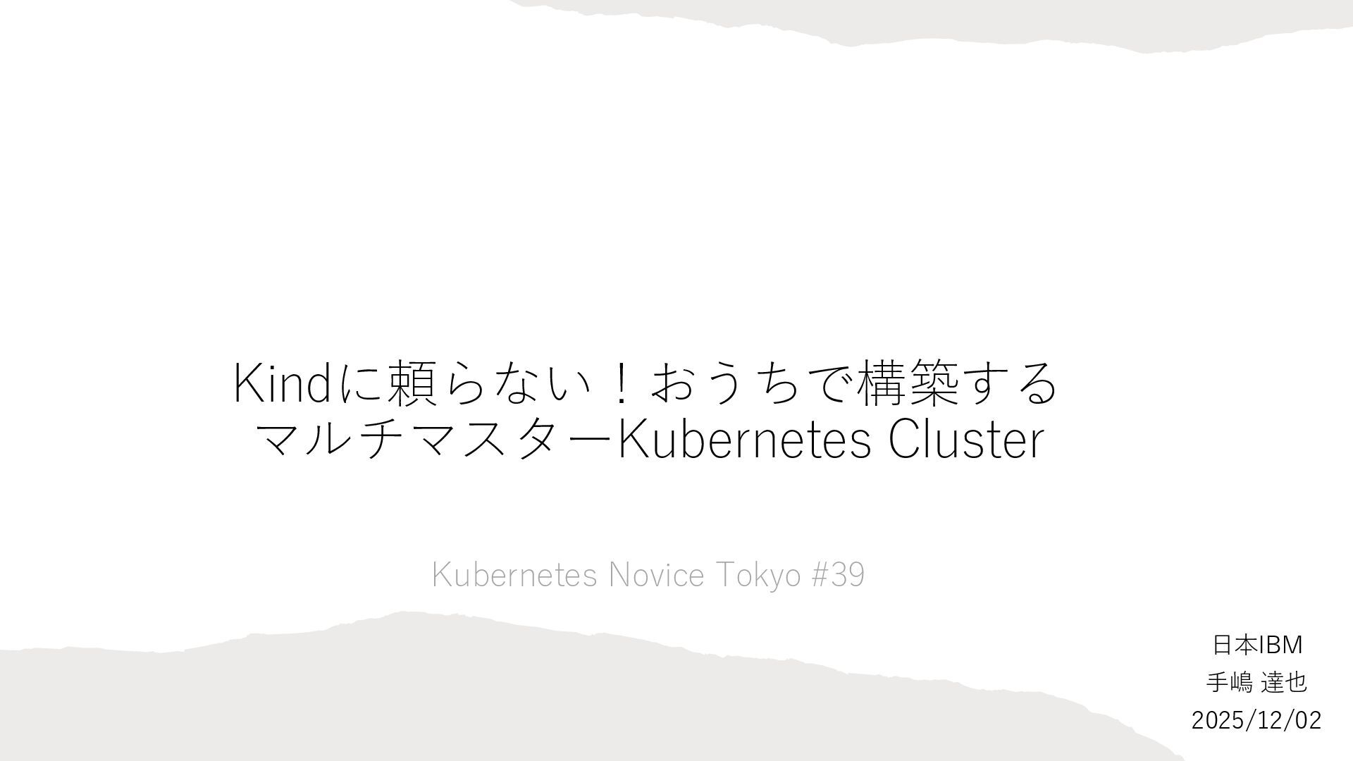 Kindに頼らない!おうちで構築する マルチマスターKubernetes Cluster 日本IBM 手嶋 達也 2025/12/02 Kubernetes Novice Tokyo