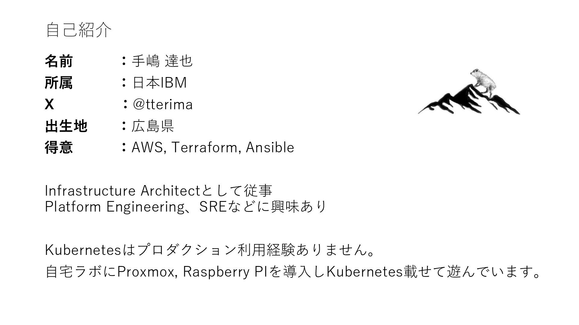 得意 :AWS, Terraform, Ansible Infrastructure Architectとして従事 Platform Engineering、SREなどに興味あり Kubernetesはプロダクション利用経験ありません。 自宅ラボにProxmox, Raspberry PIを導入しKubernetes載せて遊んでいます。