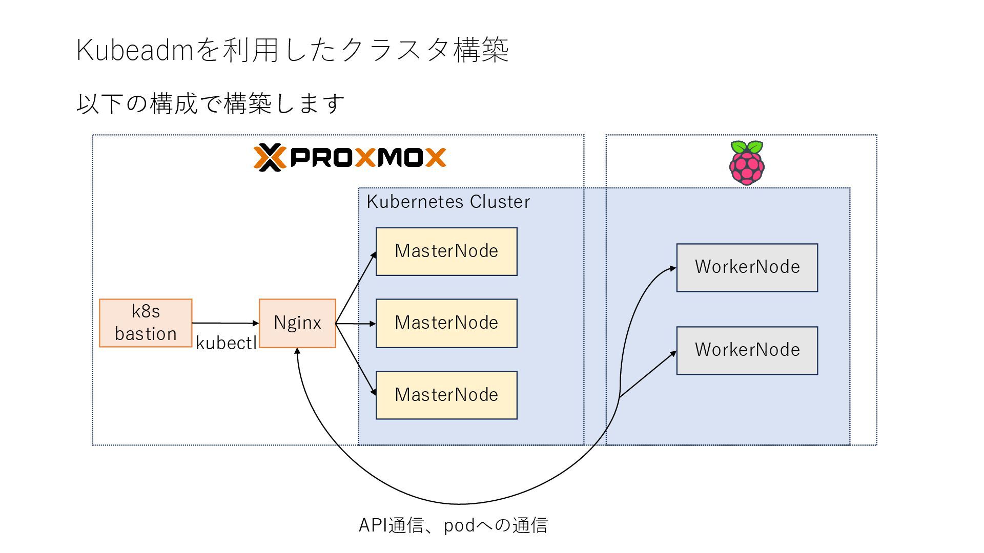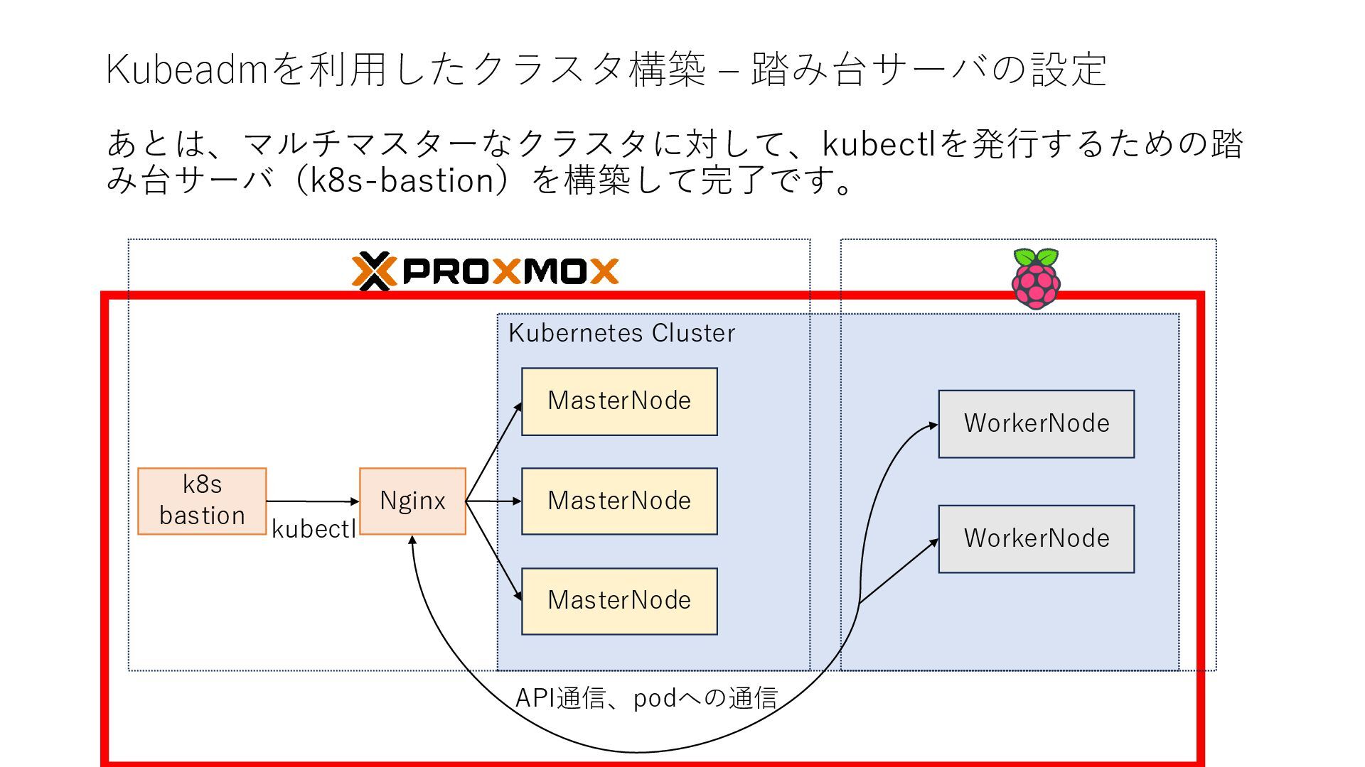 Kubeadmを利用したクラスタ構築 – 踏み台サーバの設定 あとは、マルチマスターなクラスタに対して、kubectlを発行するための踏 み台サーバ(k8s-bastion)を構築して完了です。 Kubernetes Cluster MasterNode WorkerNode WorkerNode
