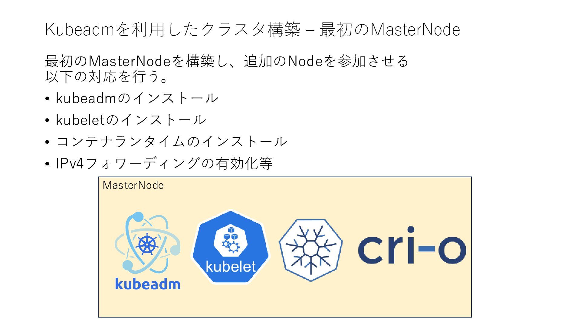 Kubeadmを利用したクラスタ構築 – 最初のMasterNode 最初のMasterNodeを構築し、追加のNodeを参加させる 以下の対応を行う。 • kubeadmのインストール • kubeletのインストール •