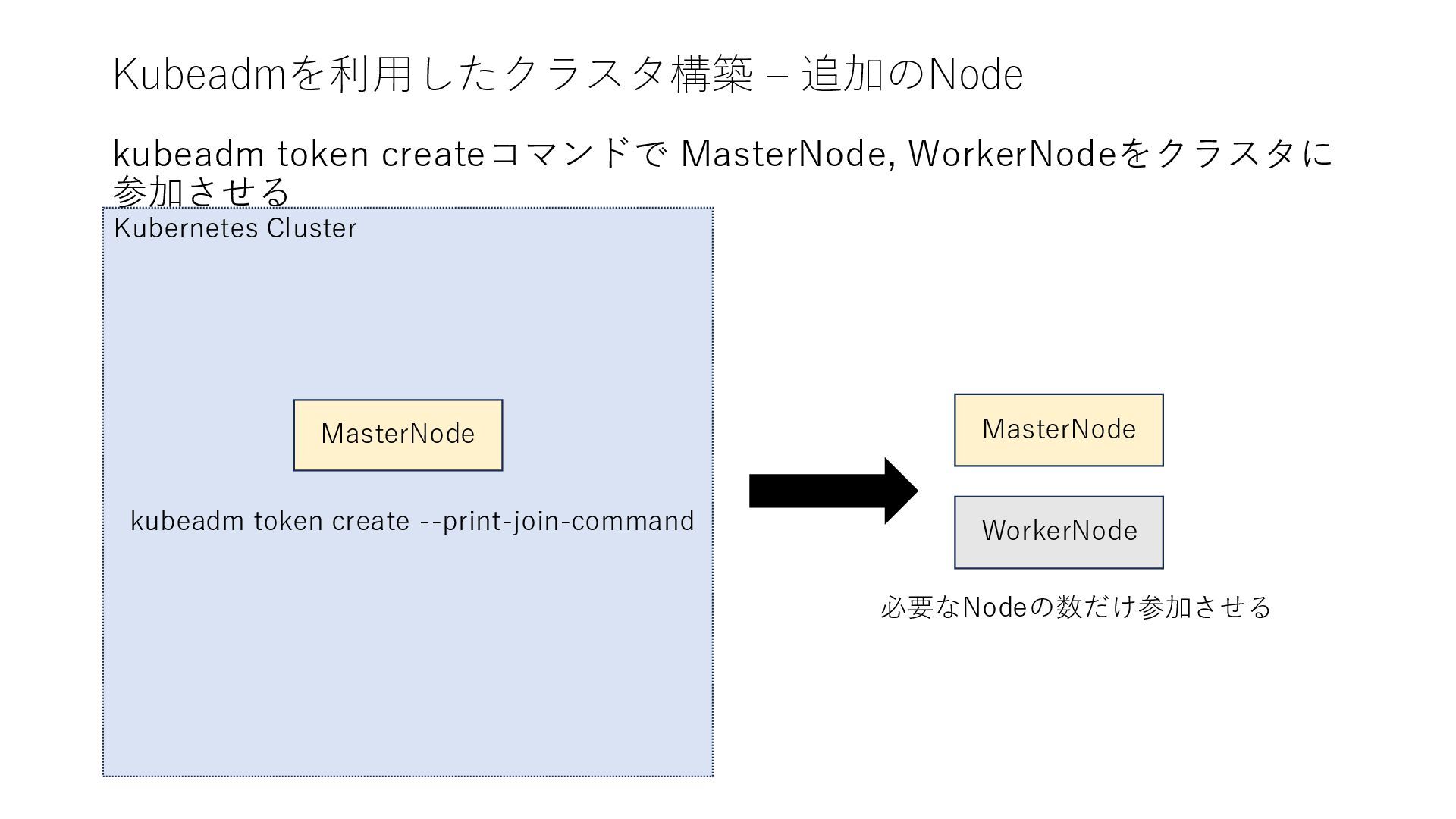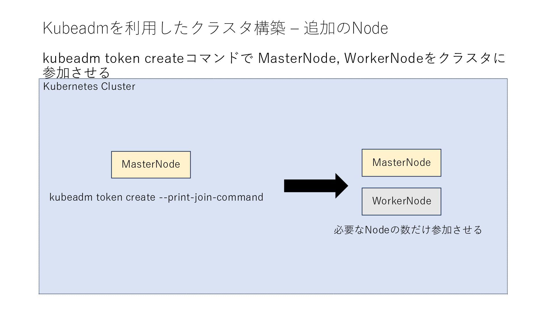Kubernetes Cluster Kubeadmを利用したクラスタ構築 – 追加のNode kubeadm token createコマンドで MasterNode, WorkerNodeをクラスタに