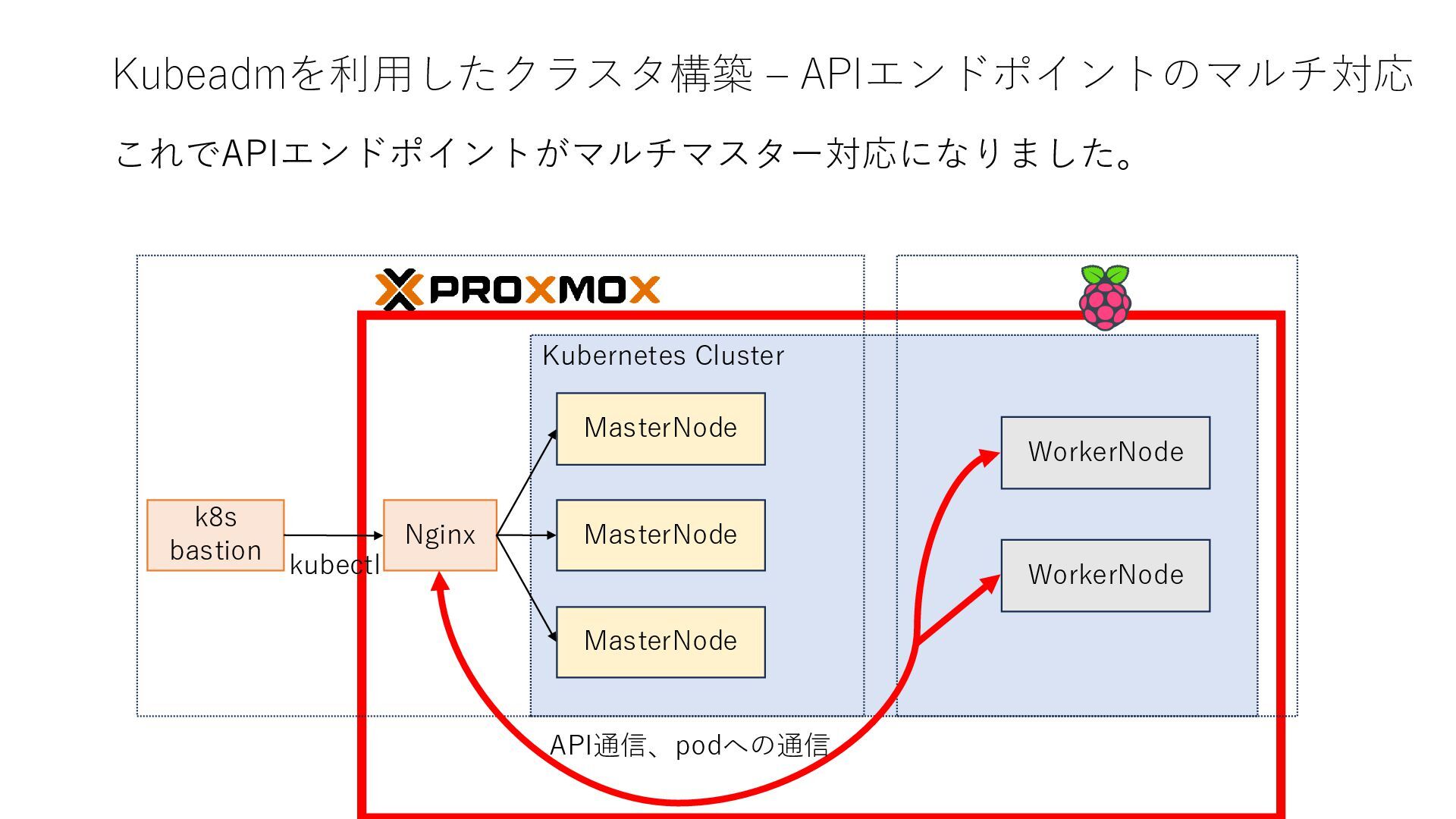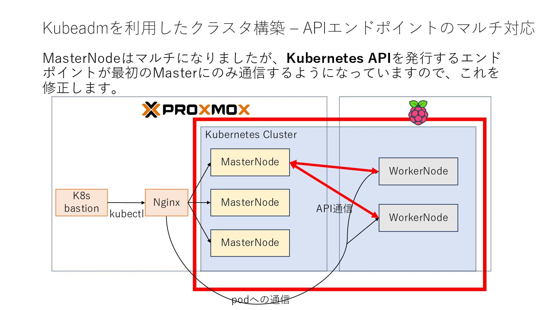 Kubeadmを利用したクラスタ構築 – APIエンドポイントのマルチ対応 MasterNodeはマルチになりましたが、Kubernetes APIを発行するエンド ポイントが最初のMasterにのみ通信するようになっていますので、これを 修正します。 Kubernetes Cluster MasterNode