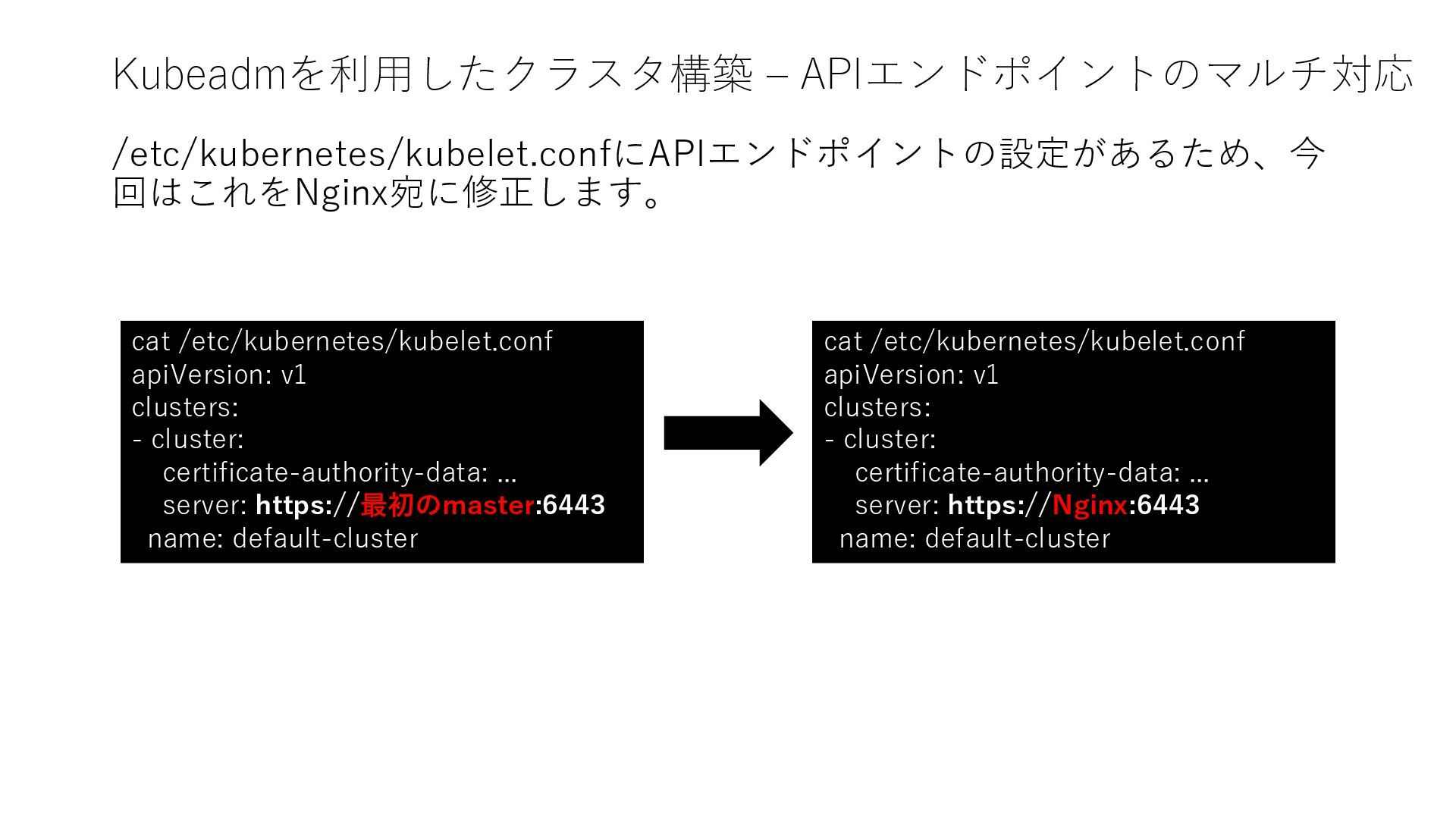 - cluster: certificate-authority-data: ... server: https://最初のmaster:6443 name: default-cluster cat /etc/kubernetes/kubelet.conf apiVersion: v1 clusters: - cluster: certificate-authority-data: ... server: https://Nginx:6443 name: default-cluster