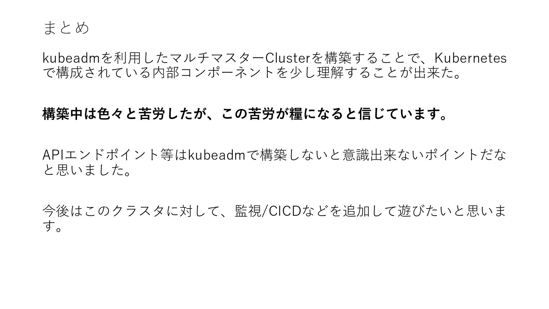 まとめ kubeadmを利用したマルチマスターClusterを構築することで、Kubernetes で構成されている内部コンポーネントを少し理解することが出来た。 構築中は色々と苦労したが、この苦労が糧になると信じています。 APIエンドポイント等はkubeadmで構築しないと意識出来ないポイントだな と思いました。 今後はこのクラスタに対して、監視/CICDなどを追加して遊びたいと思いま す。