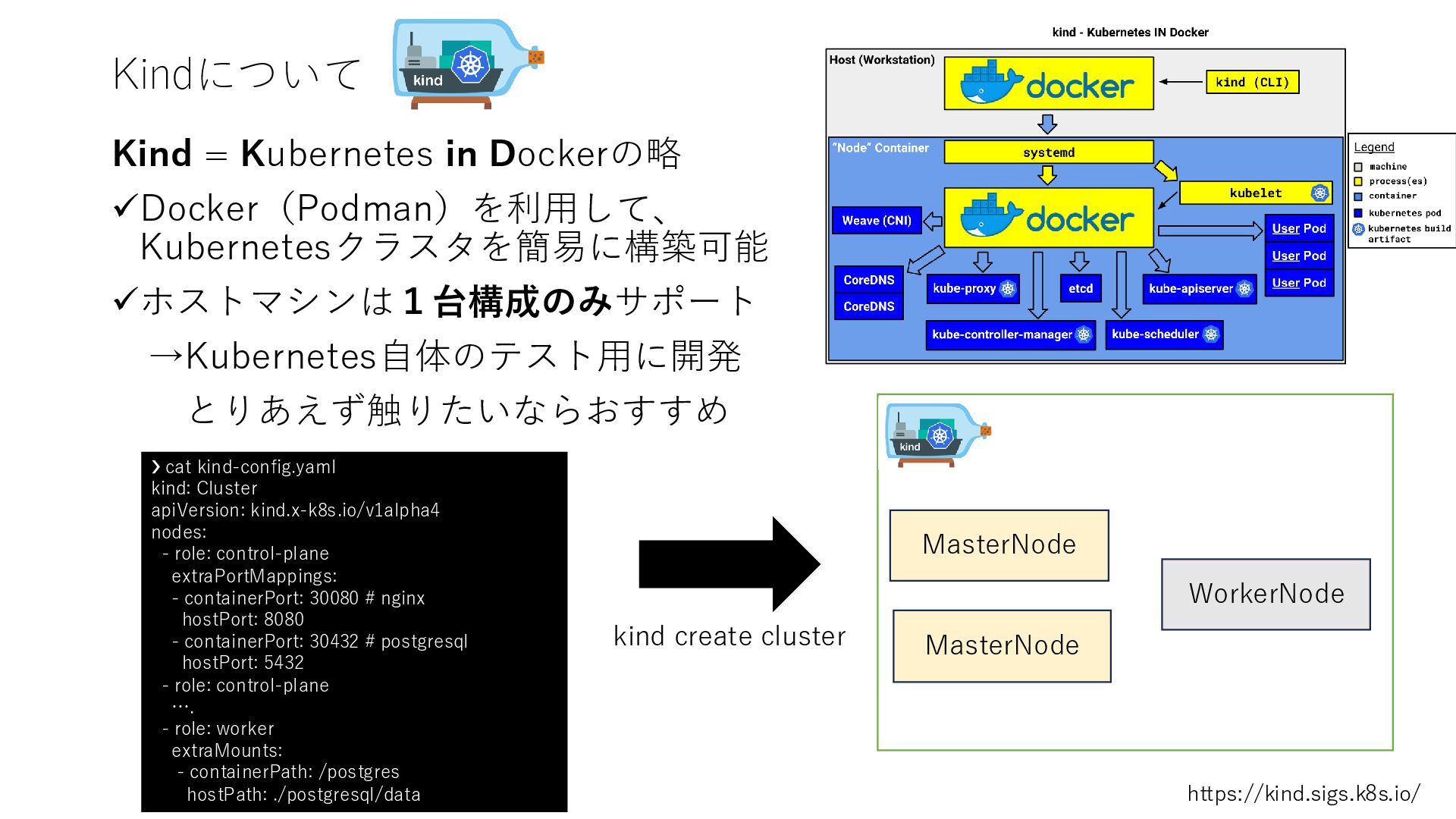 Kindについて Kind = Kubernetes in Dockerの略 ✓Docker(Podman)を利用して、 Kubernetesクラスタを簡易に構築可能 ✓ホストマシンは1台構成のみサポート →Kubernetes自体のテスト用に開発