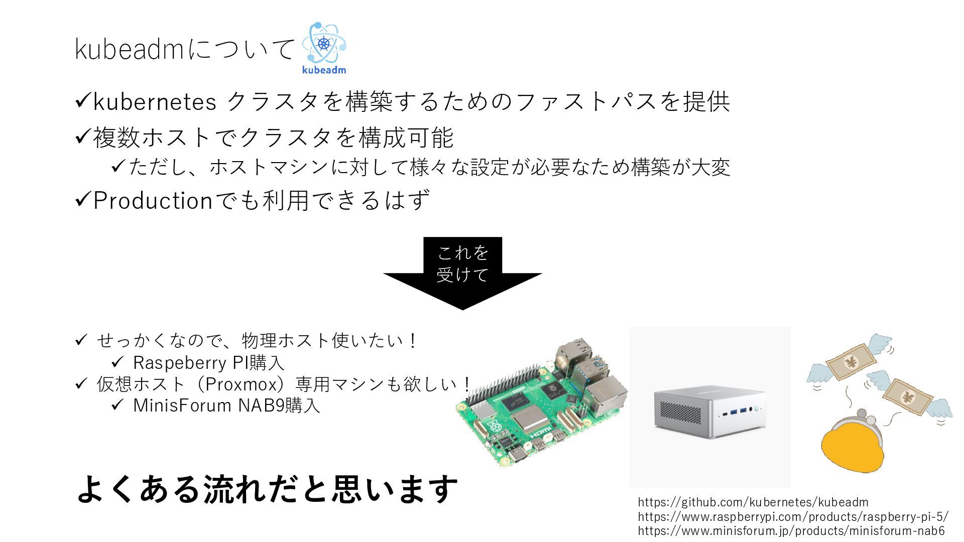 kubeadmについて ✓kubernetes クラスタを構築するためのファストパスを提供 ✓複数ホストでクラスタを構成可能 ✓ただし、ホストマシンに対して様々な設定が必要なため構築が大変 ✓Productionでも利用できるはず https://github.com/kubernetes/kubeadm https://www.raspberrypi.com/products/raspberry-pi-5/ https://www.minisforum.jp/products/minisforum-nab6 ✓