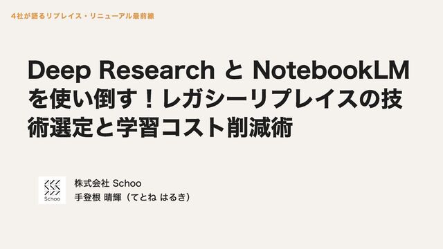 Deep Research と NotebookLM を使い倒す!レガシーリプレイスの技 術選定と学習コスト削減術 株式会社 Schoo 手登根 晴輝(てとね