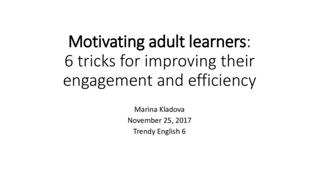 During my talk we’ll discuss different types of motivation and I’ll share 6 tricks which I used to encourage my adult learners to keep calm and master English.