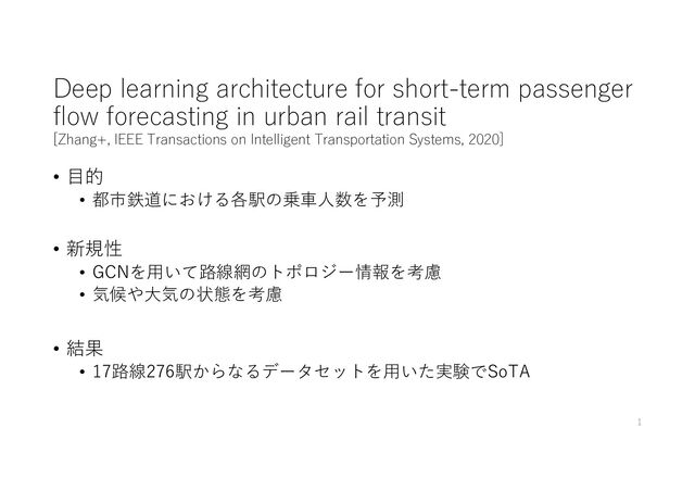 rail transit [Zhang+, IEEE Transactions on Intelligent Transportation Systems, 2020] • 目的 • 都市鉄道における各駅の乗車人数を予測 • 新規性 • GCNを用いて路線網のトポロジー情報を考慮 • 気候や大気の状態を考慮 • 結果 • 17路線276駅からなるデータセットを用いた実験でSoTA 1