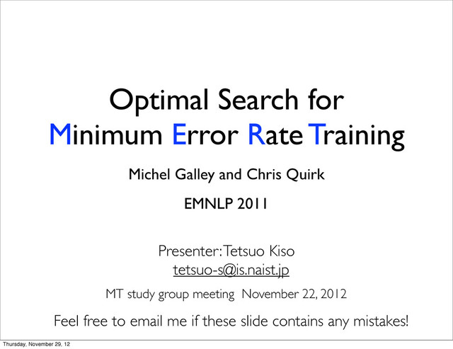 Chris Quirk EMNLP 2011 Presenter: Tetsuo Kiso MT study group meeting November 22, 2012 Feel free to email me if these slide contains any mistakes! [email protected] Thursday, November 29, 12